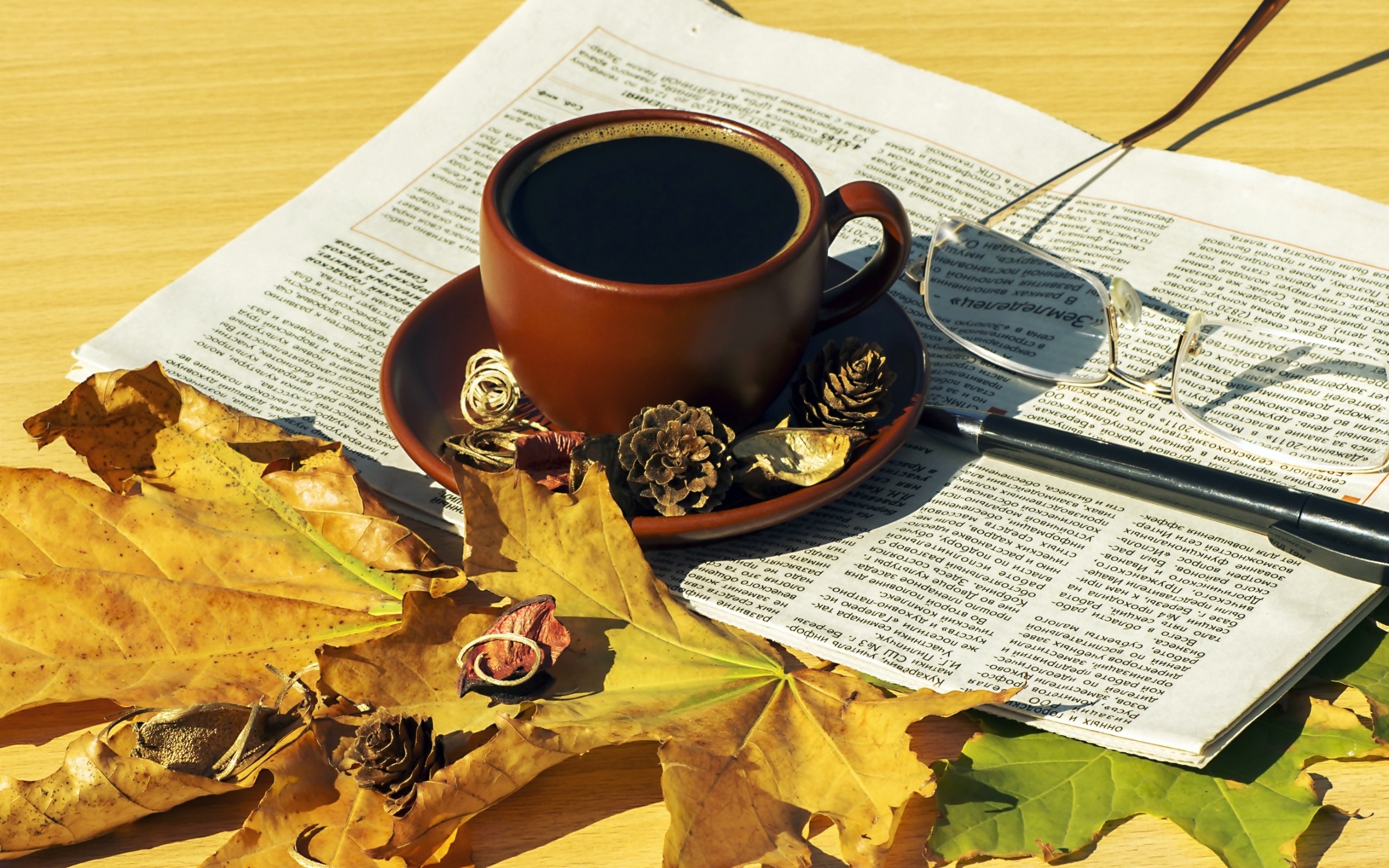 Edytor tapety: Filiżanka, Kawy, Jesienne, Liście, Gazeta, Szyszki