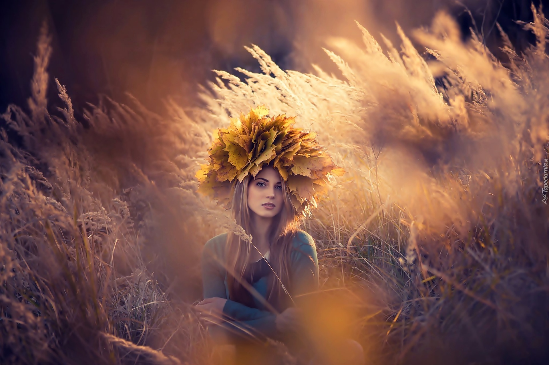 Edytor tapety: Jesień, Kobieta, Twarz, Wianek, Liście, Klonu, Suche, Trawy