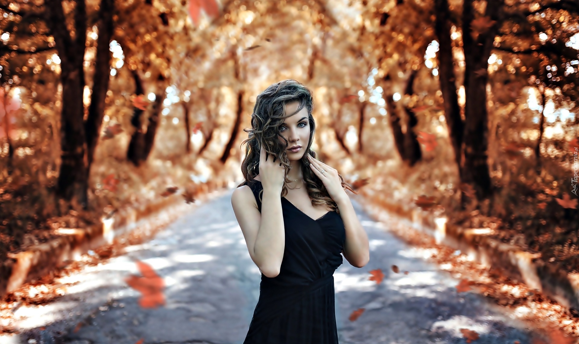 Edytor tapety: Jesień, Park, Aleja, Kobieta, Liście, Drzewa