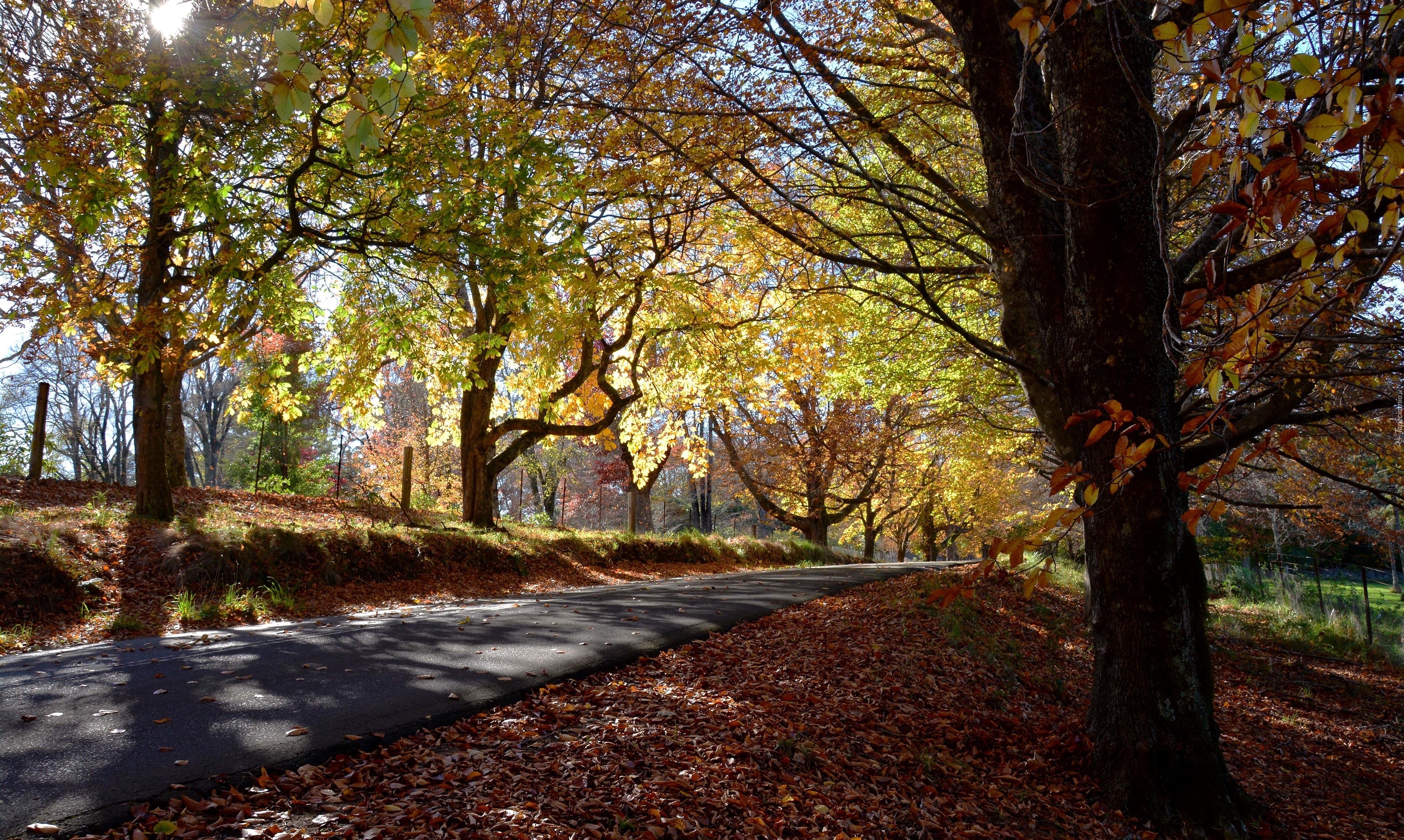 Edytor tapety: Jesień, Drzewa, Droga, Przebijające, Światło, Liście