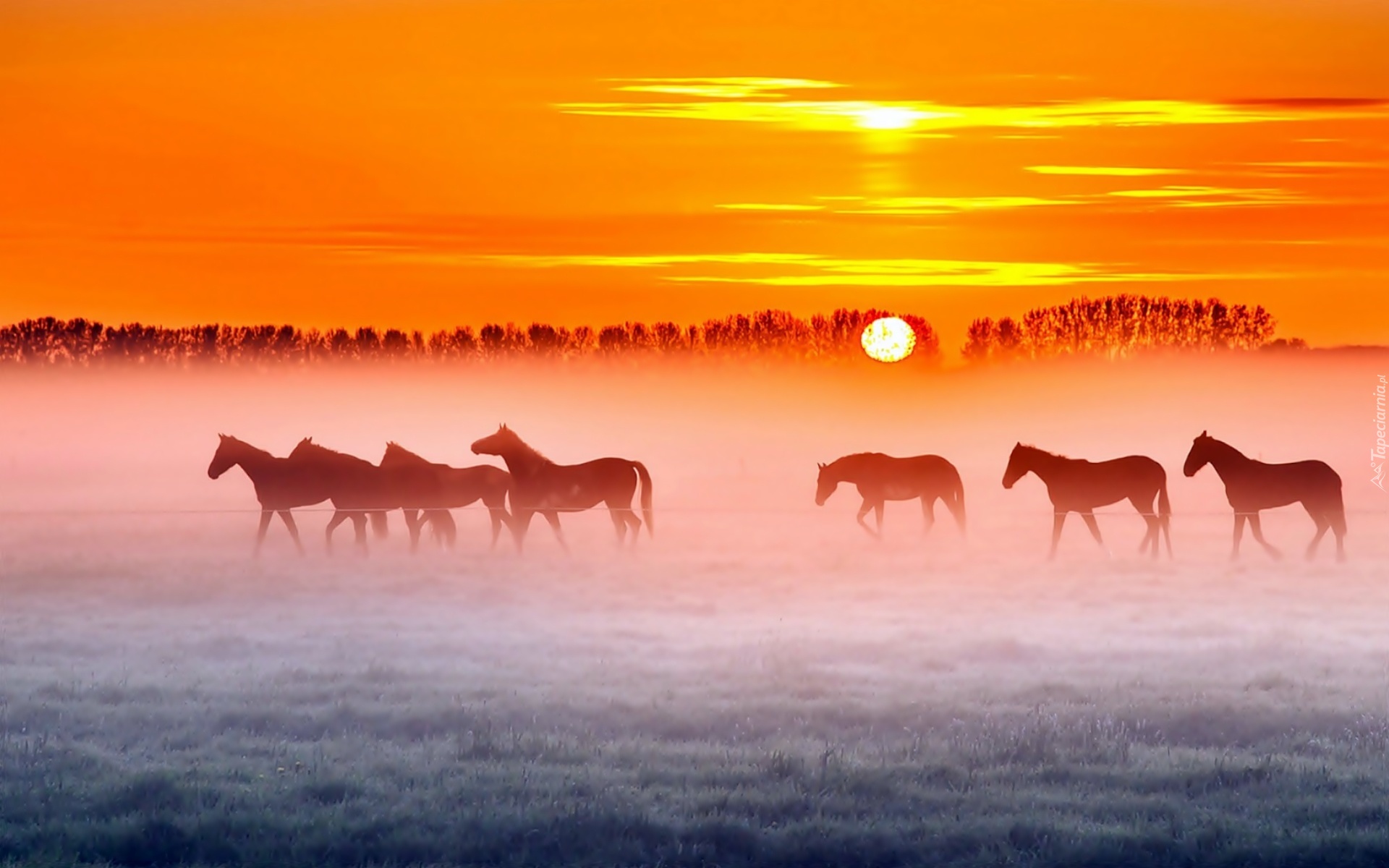 Edytor tapety: Stado, Konie, Łąka, Pastwisko, Wschód Słońca, Mgła