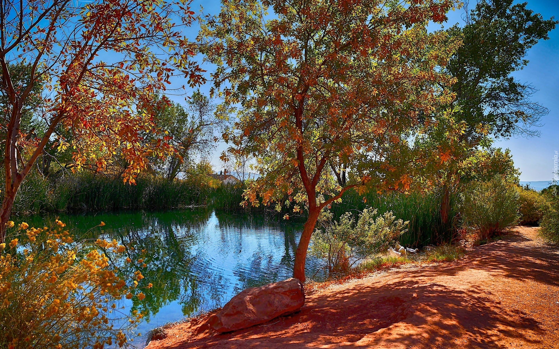 Edytor tapety: Jesień, Drzewa, Staw, Kaczki, Brzeg