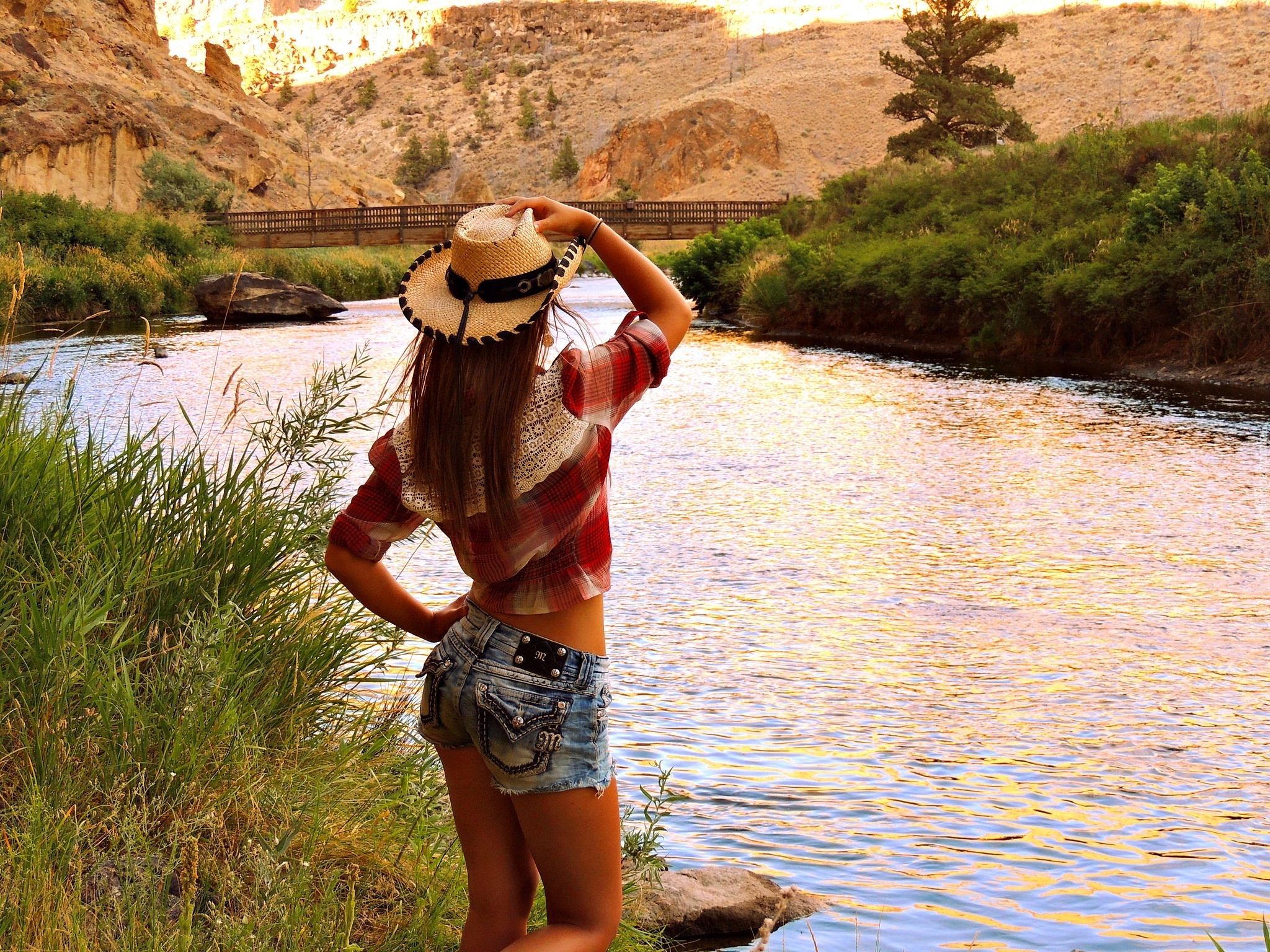 Edytor tapety: Dziewczyna, Kapelusz, Rzeka, Most, Wzgórza