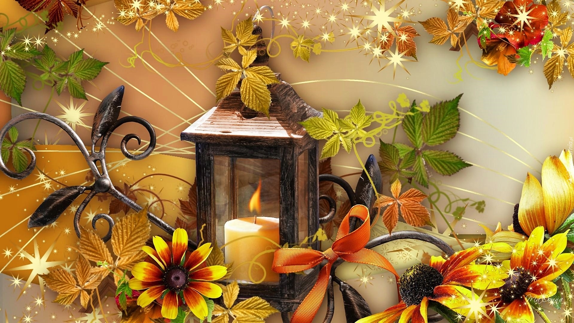 Edytor tapety: Jesienna, Kompozycja, Lampion, Świeca, Kwiaty, Rudbekia, Liście