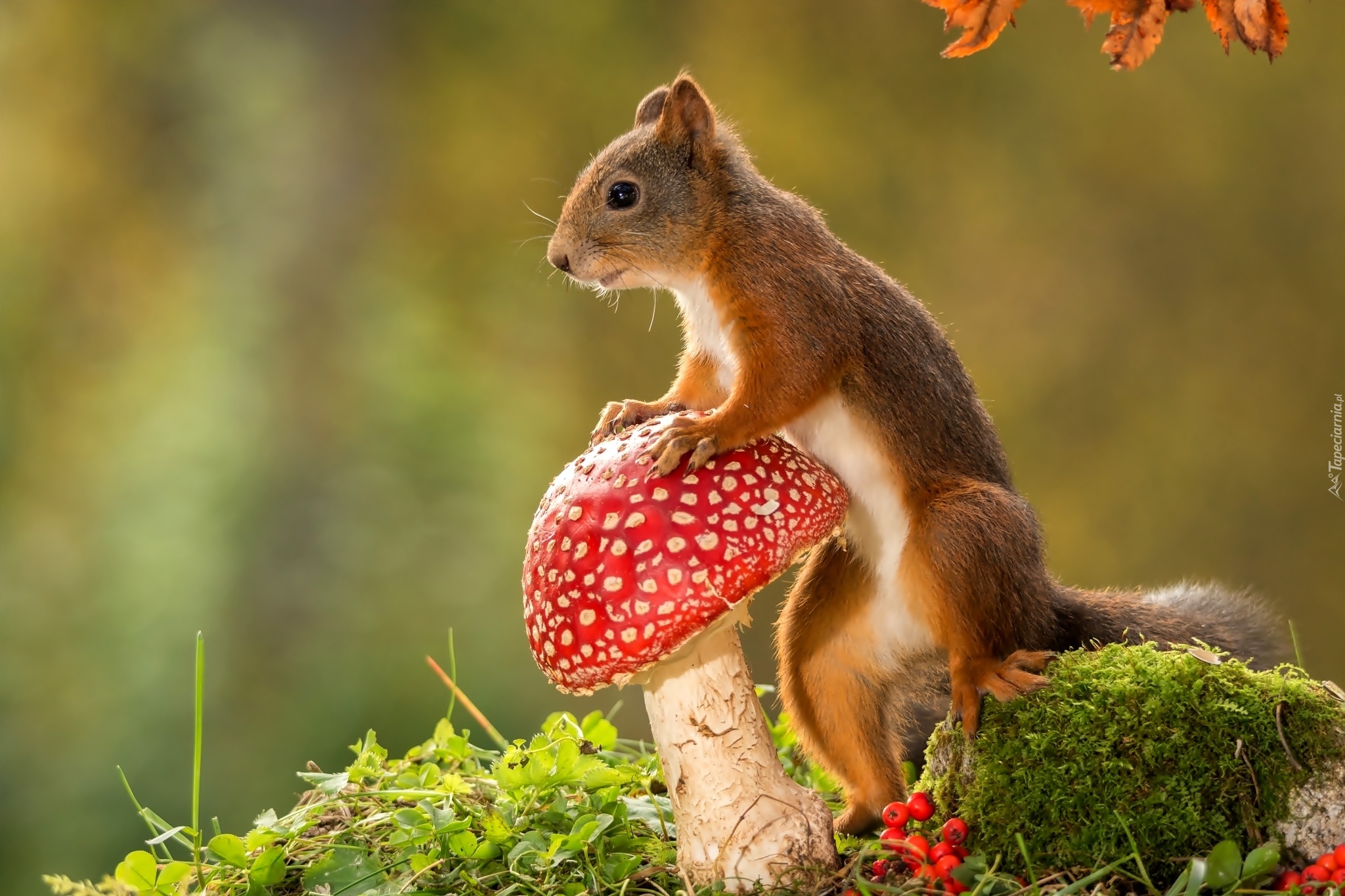 Edytor tapety: Jesień, Wiewiórka, Grzyb, Mech, Jarzebina