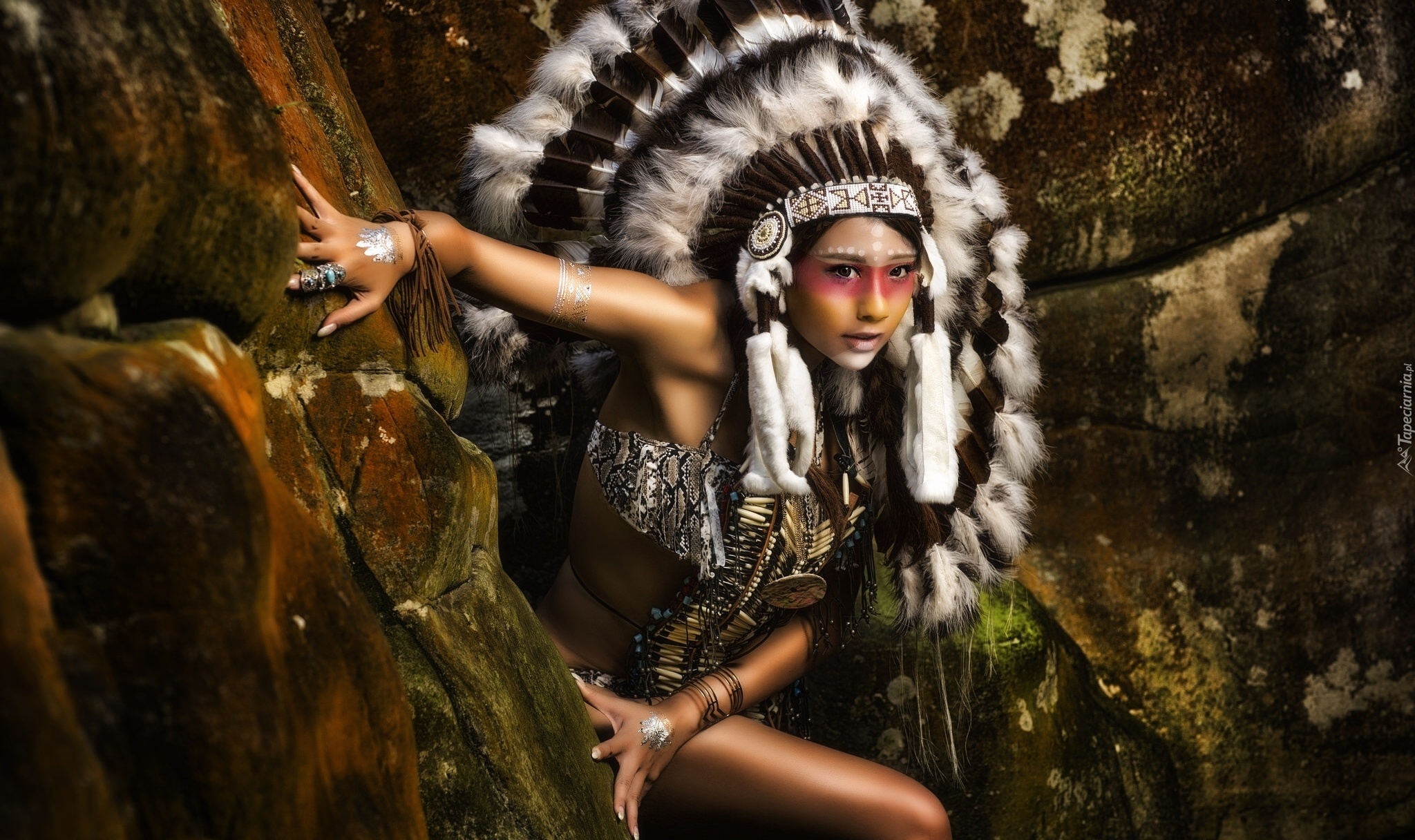 Edytor tapety: Dziewczyna, Indianka, Pióropusz, Biżuteria, Skały