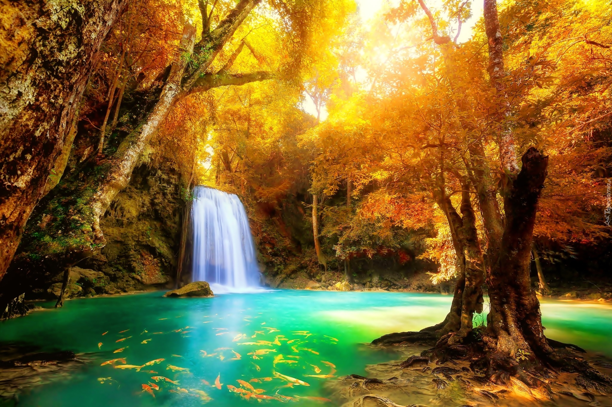 Edytor tapety: Wodospad, Rzeka, Ryby, Drzewa, Jesień