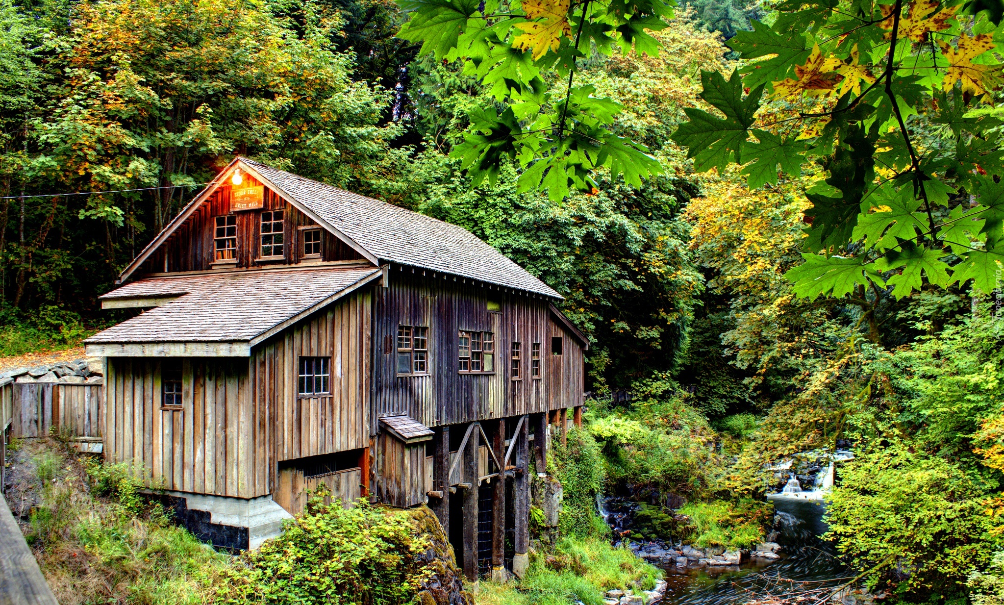 Edytor tapety: Drewniany, Młyn, Nad, Rzeką, W, Lesie, Kaskady, Kamienie