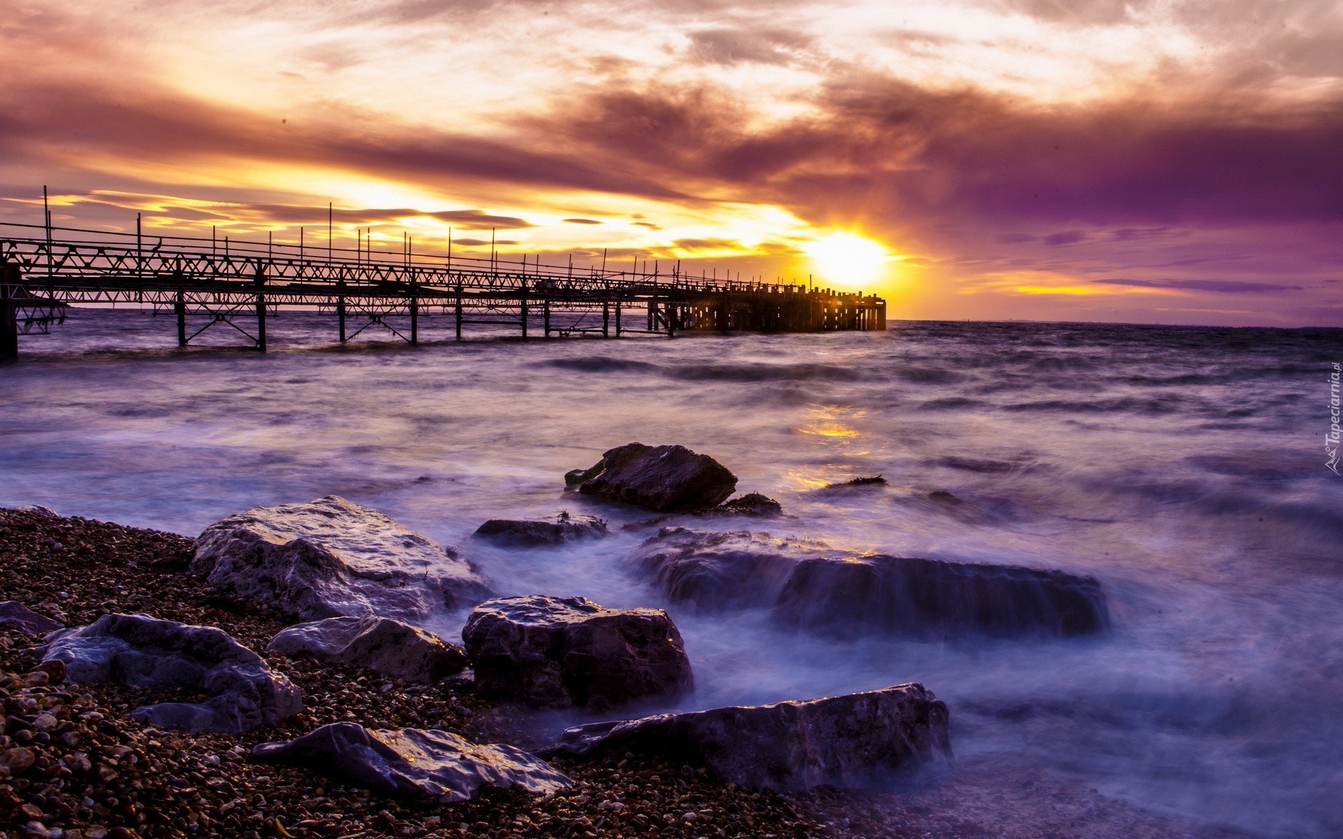 Edytor tapety: Molo, Chmury, Zachód Słońca, Skały, Fale