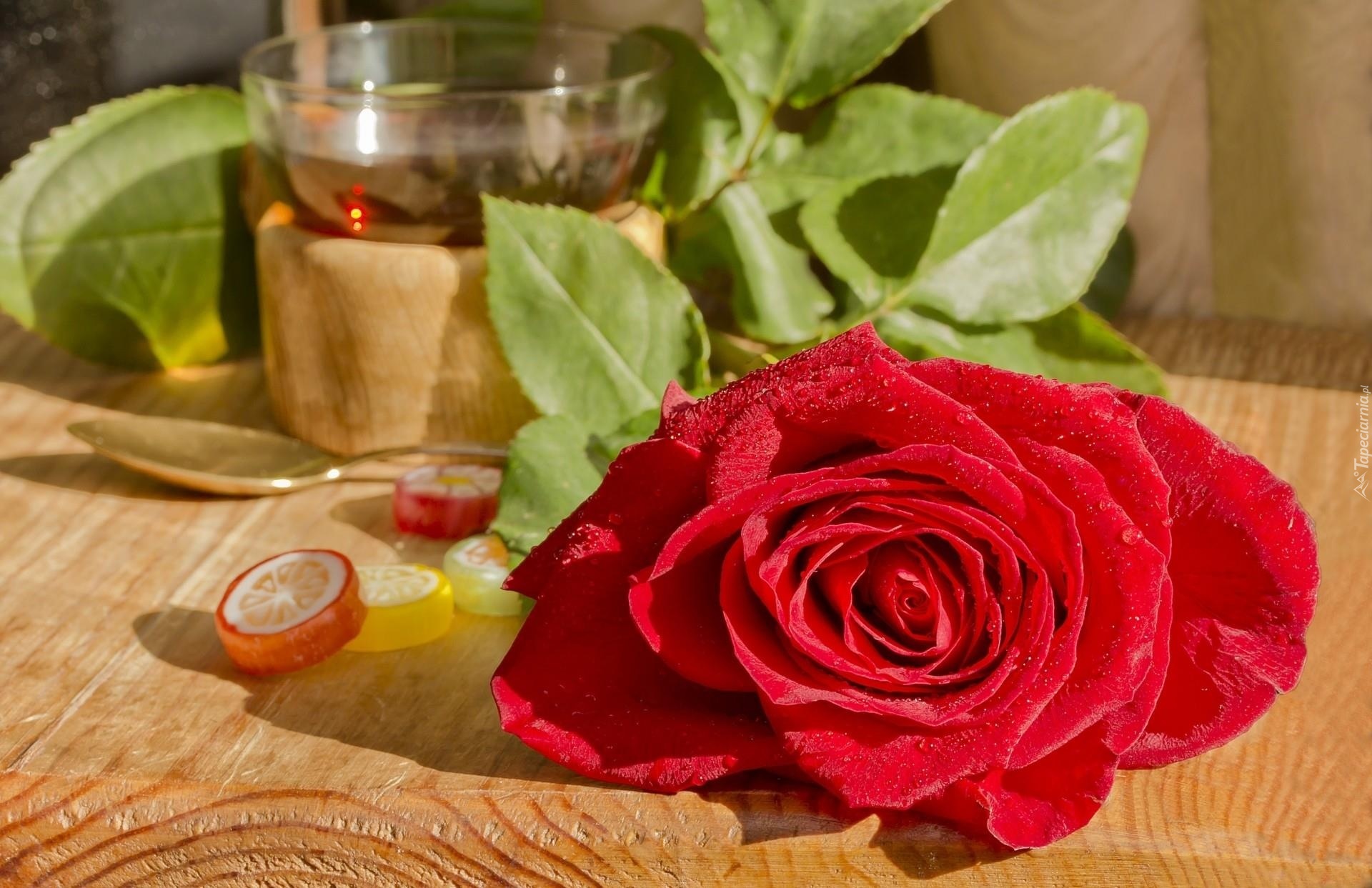 Edytor tapety: Czerwona, Róża, Filiżanka, Herbaty, Słodycze, Krople, Deszczu