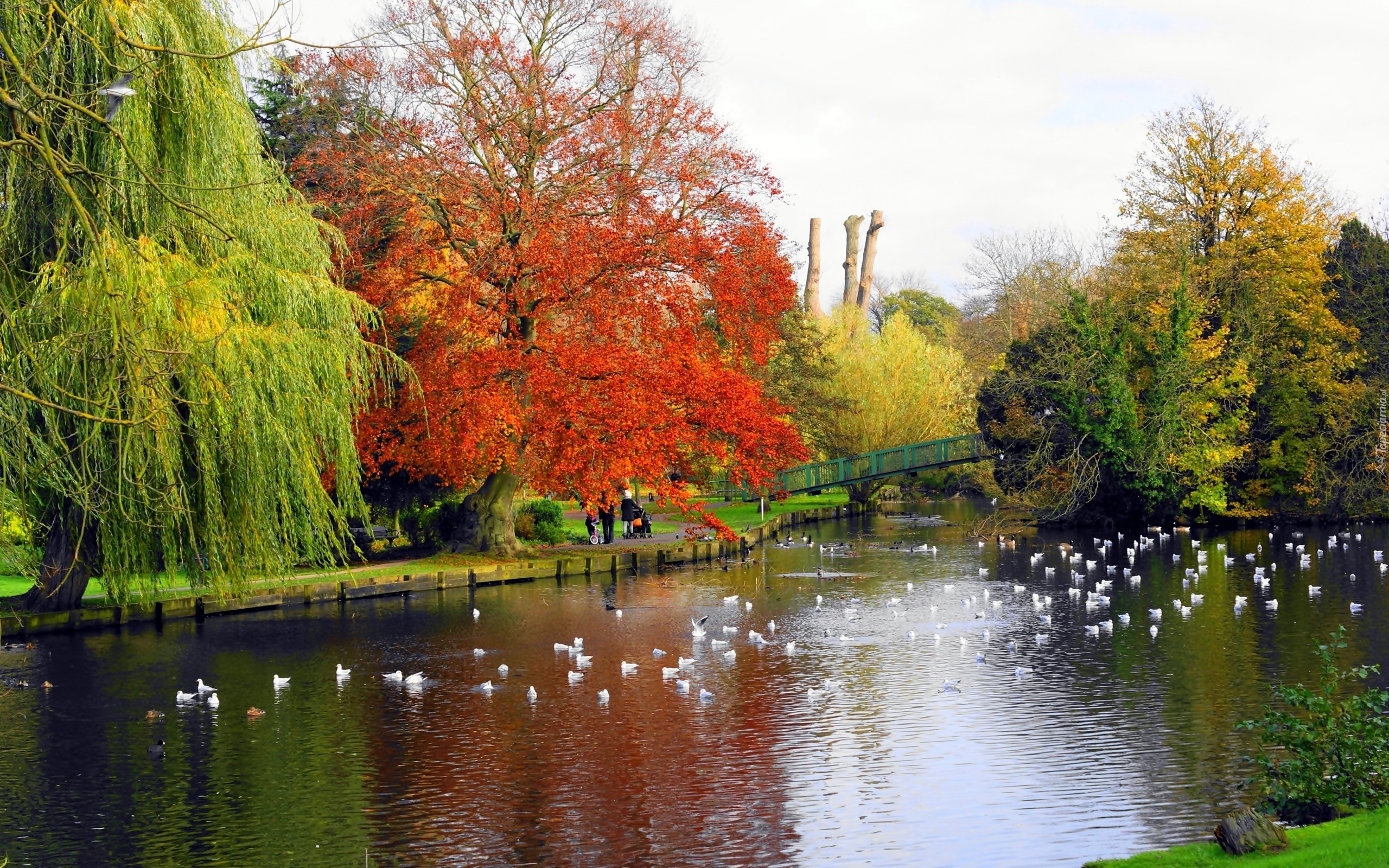 Edytor tapety: Rzeka, Kaczki, Most, Park, Kolorowa, Jesień