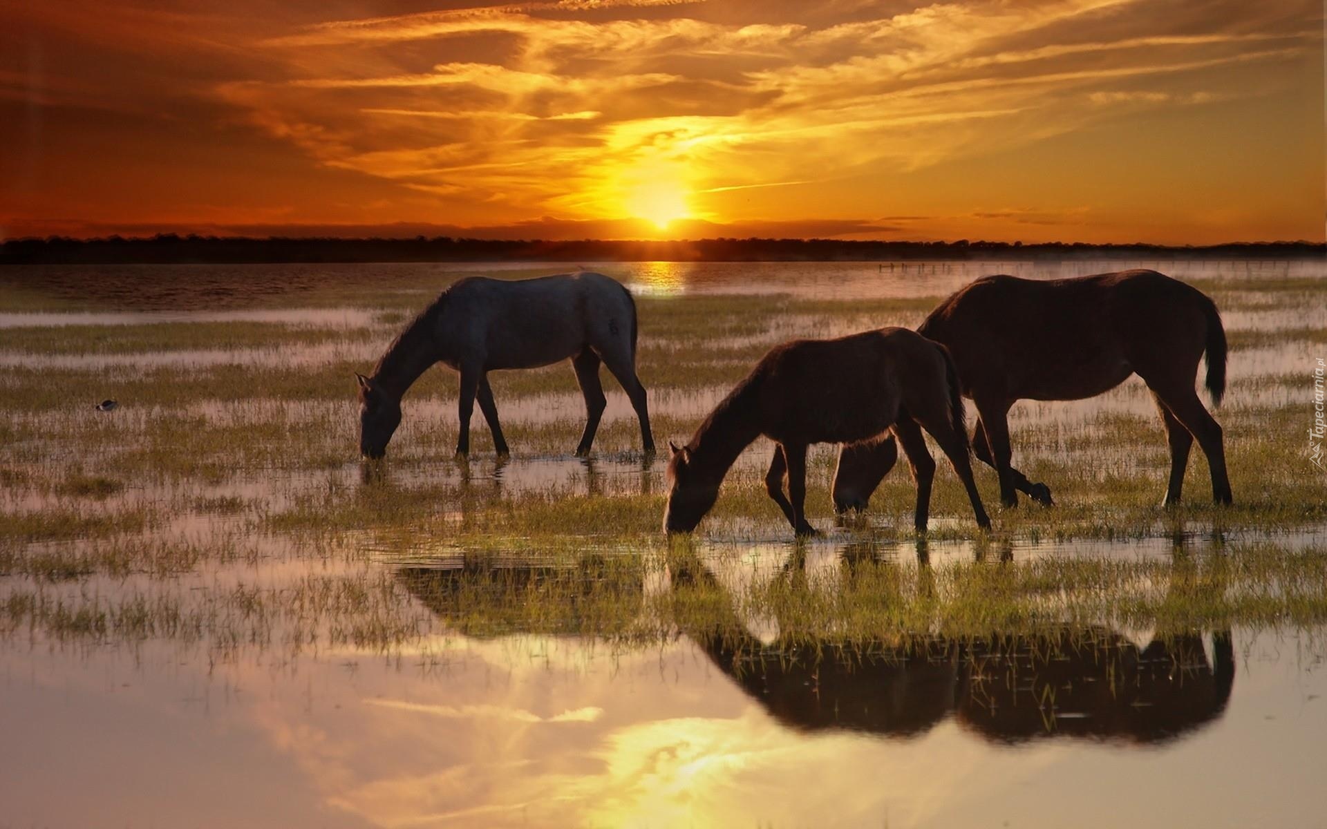 Edytor tapety: Konie, Rzeka, Zachód, Słońca
