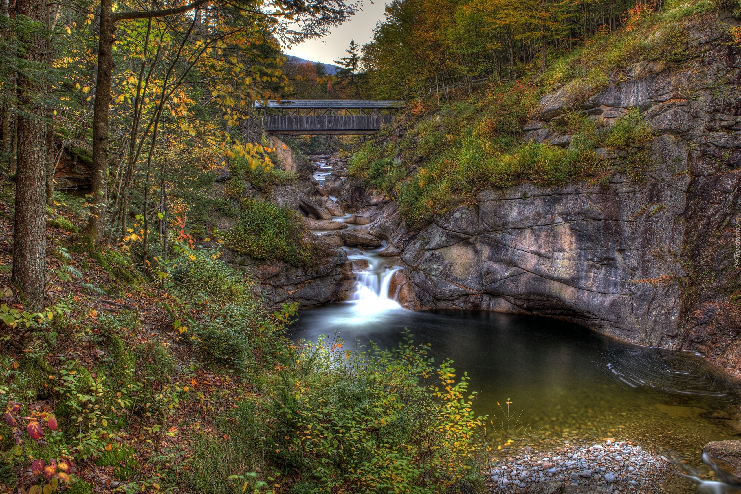 Edytor tapety: Mostek, Wodospad, Las, Skały