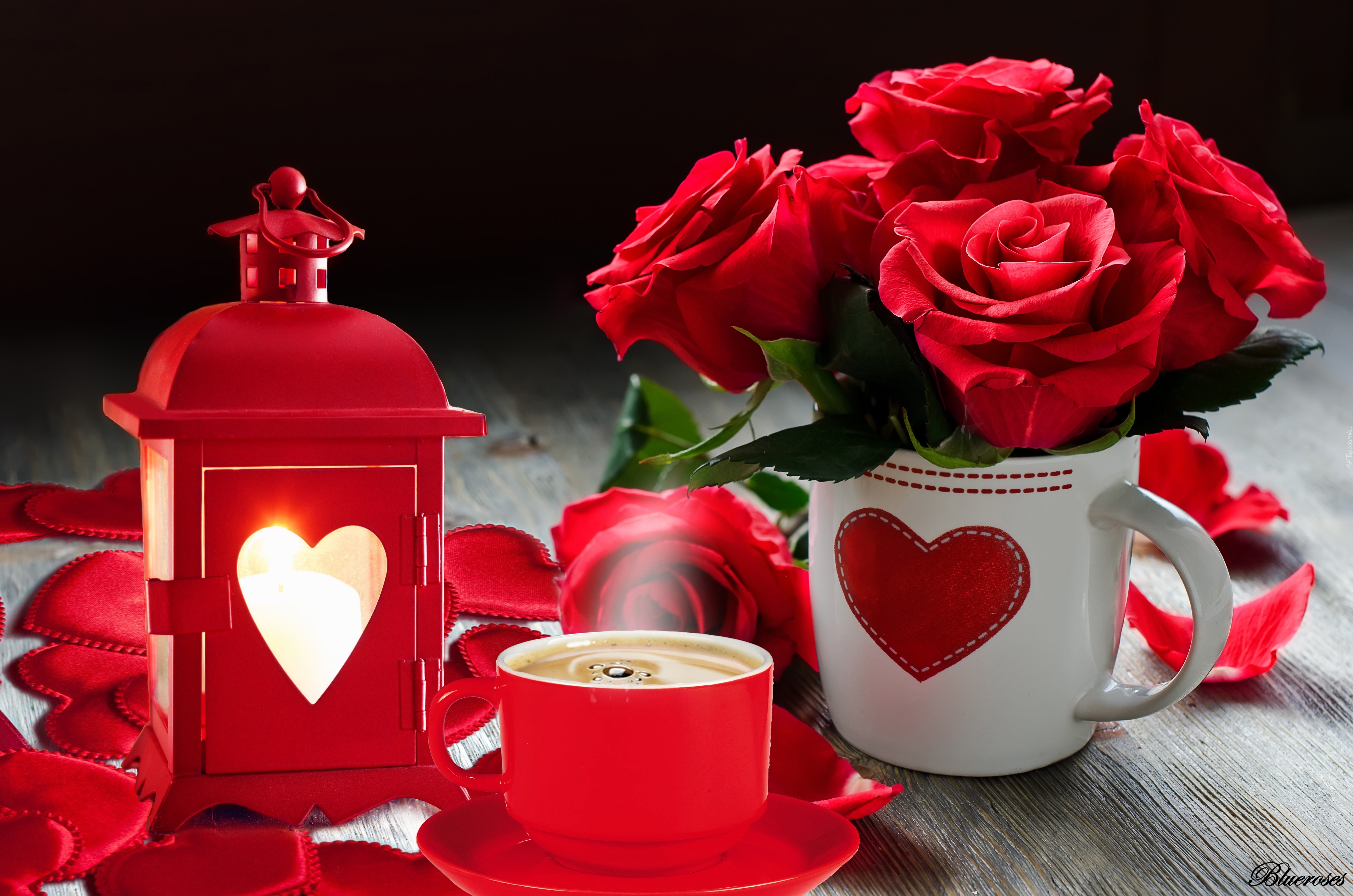 Edytor tapety: Róże, Kawa, Lampion, Świeczka, Miłosne, Kompozycja