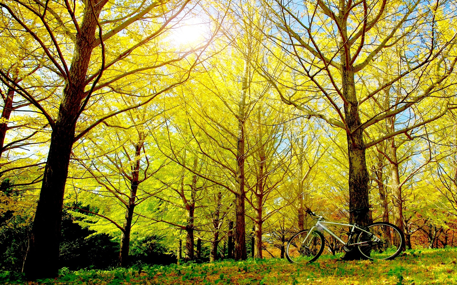Edytor tapety: Las, Liściasty, Rower, Oparty, O, Drzewo, Promienie, Słońca