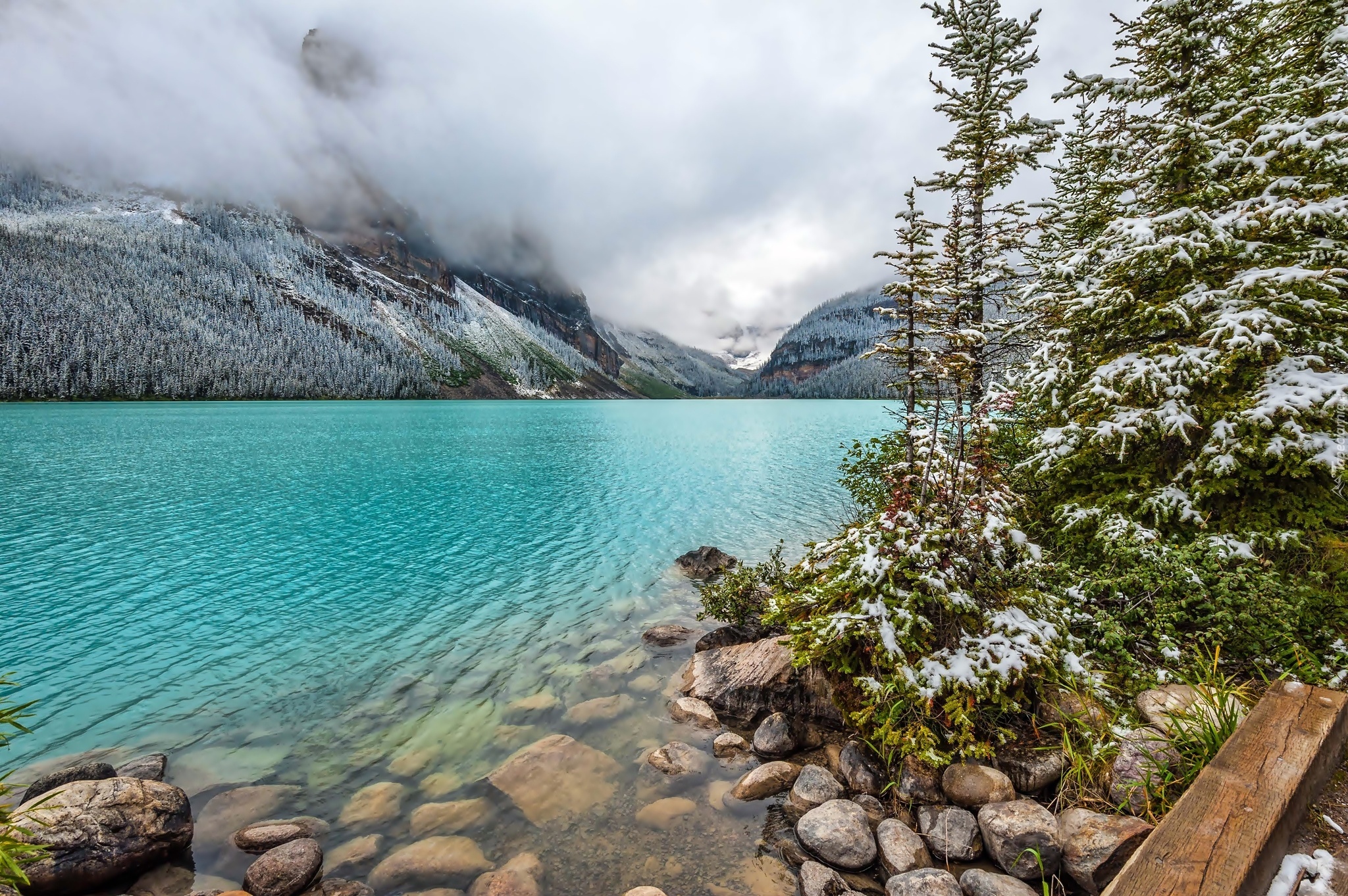Edytor tapety: Zima, Góry, Mgła, Jezioro, Kamienie, Drzewa