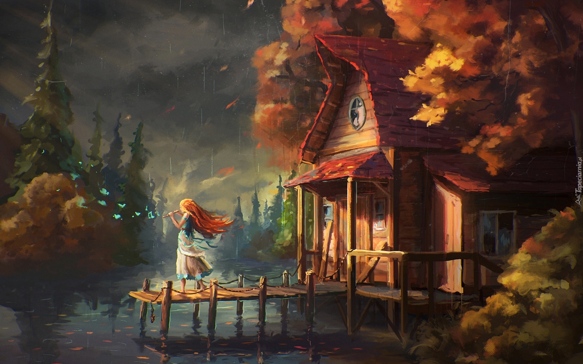 Edytor tapety: Dziewczyna, Grafika, Dom, Pomost, Rzeka, Jesień