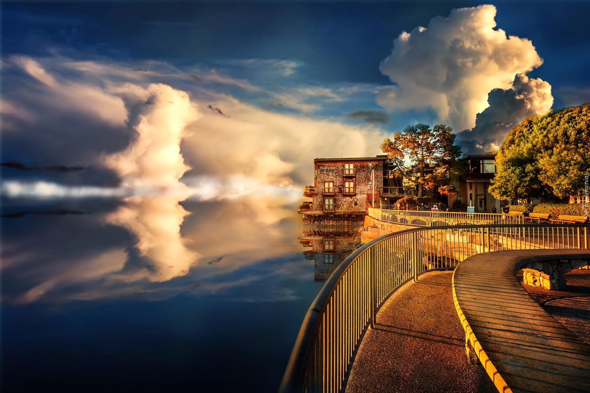 Edytor tapety: Morze, Wybrzeże, Domy, Chmury, Świt