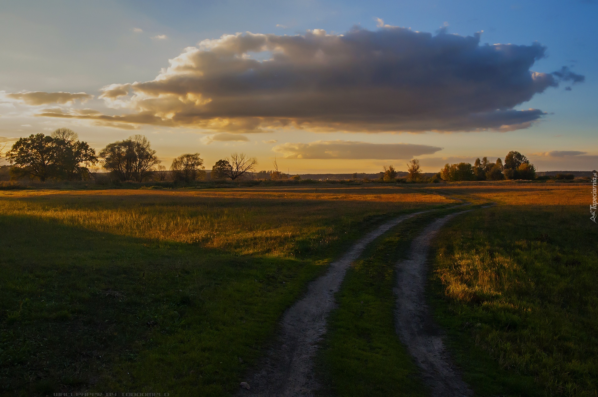Edytor tapety: Droga polna, do chmur, przez łąki, o zachodzie.