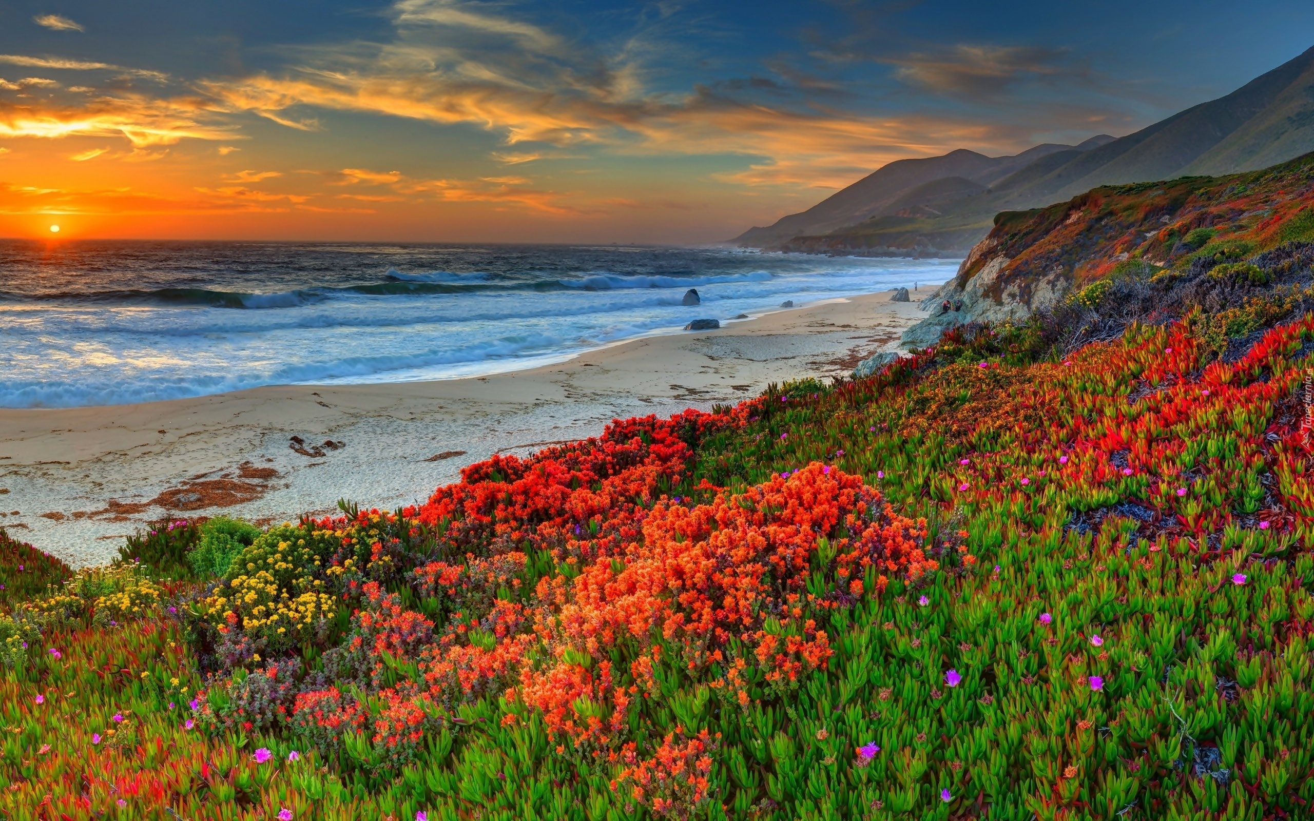Edytor tapety: Morze, Plaża, Kwiaty, Góry, Zachód Słońca, Wybrzeże