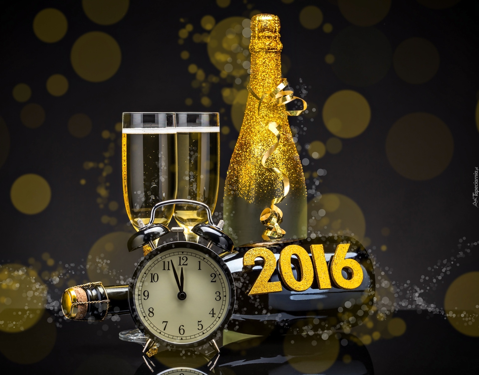 Edytor tapety: Nowy Rok, 2016, Szampan, Zegar, Butelka, Kieliszki