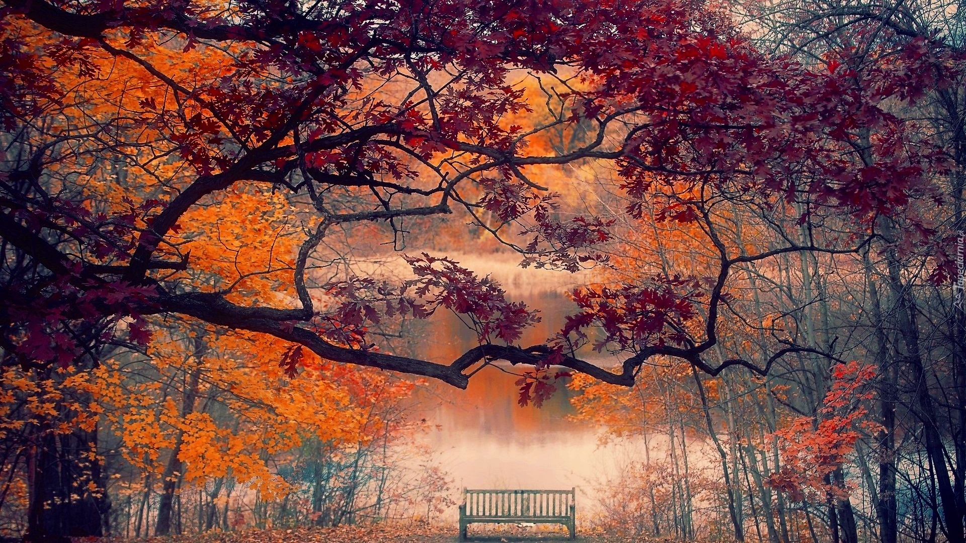 Edytor tapety: Park, Mgła, Staw, Drzewa, Ławka