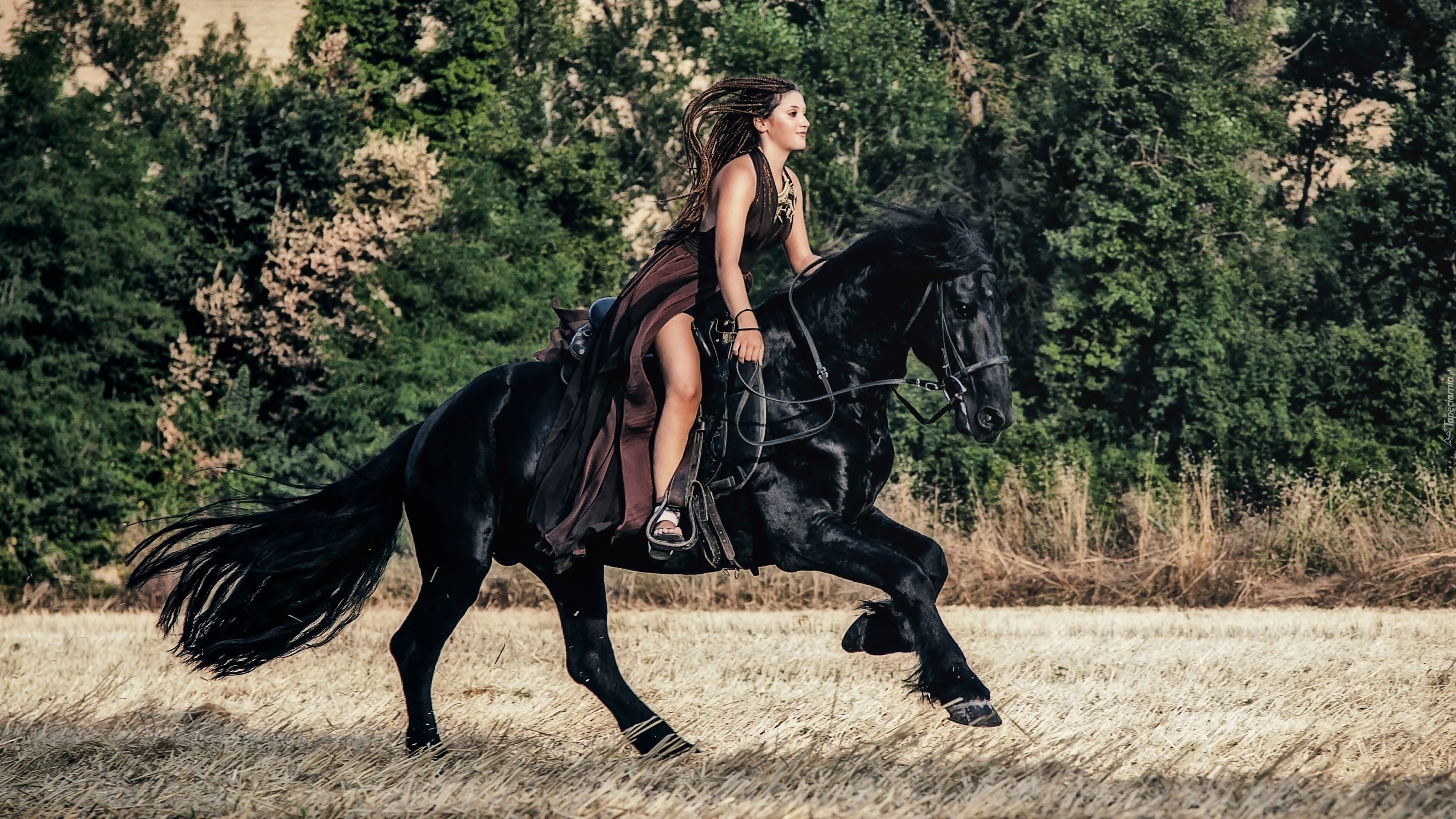 Edytor tapety: Kobieta, Kary, Koń, Pole, Drzewa