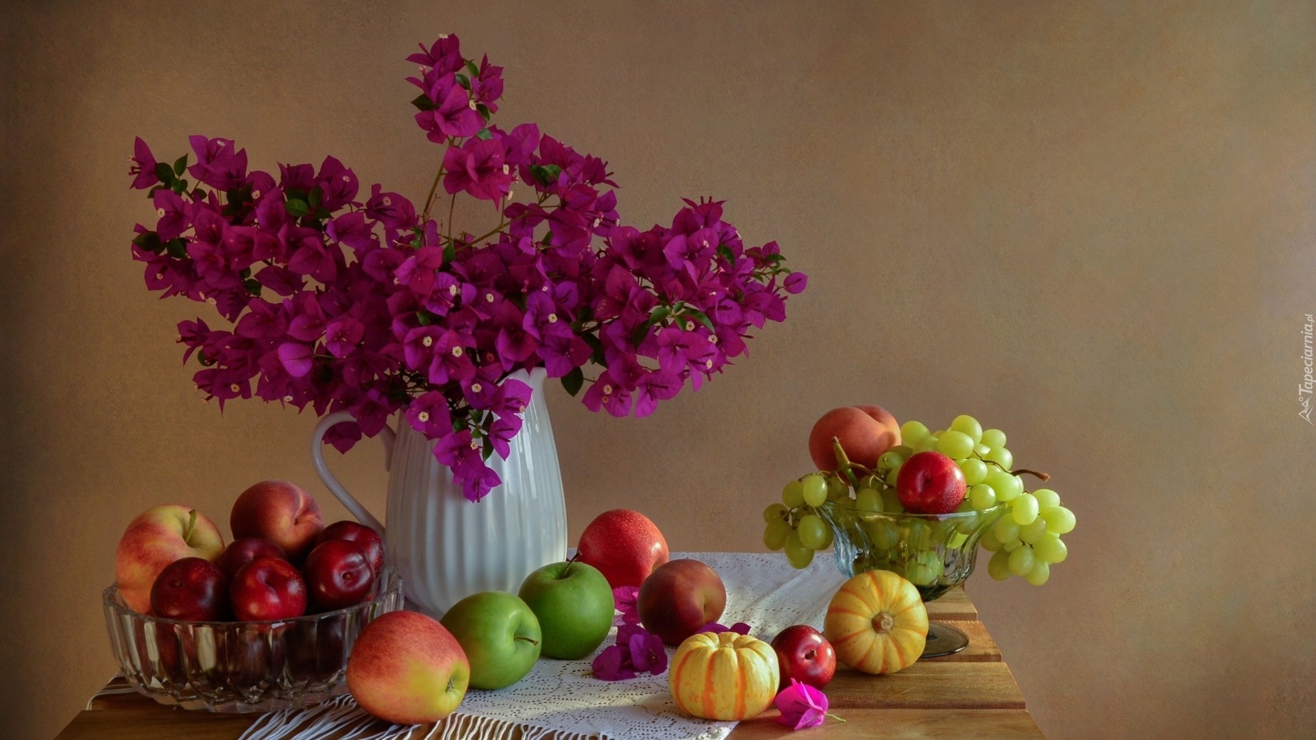 Edytor tapety: Kompozycja, Dekoracja, Kwiaty, Bugenwilla, Jabłka, Winogrona