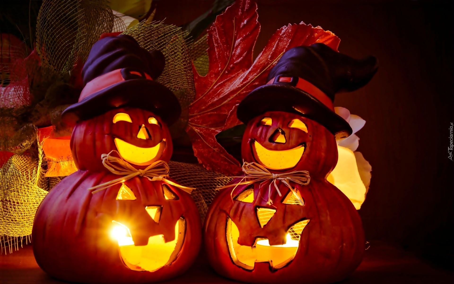 Edytor tapety: Halloween, Swiecące, Dynie, Kapelusze