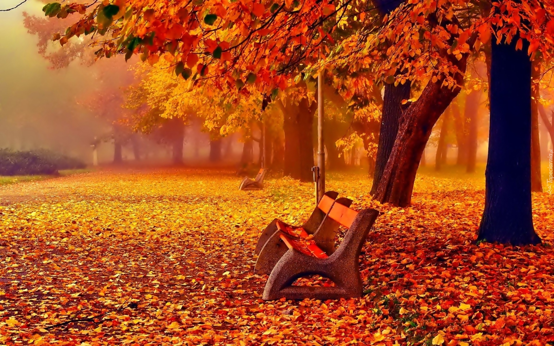 Edytor tapety: Park, Aleja, Ławki, Drzewa, Liście, Mgła, Jesień