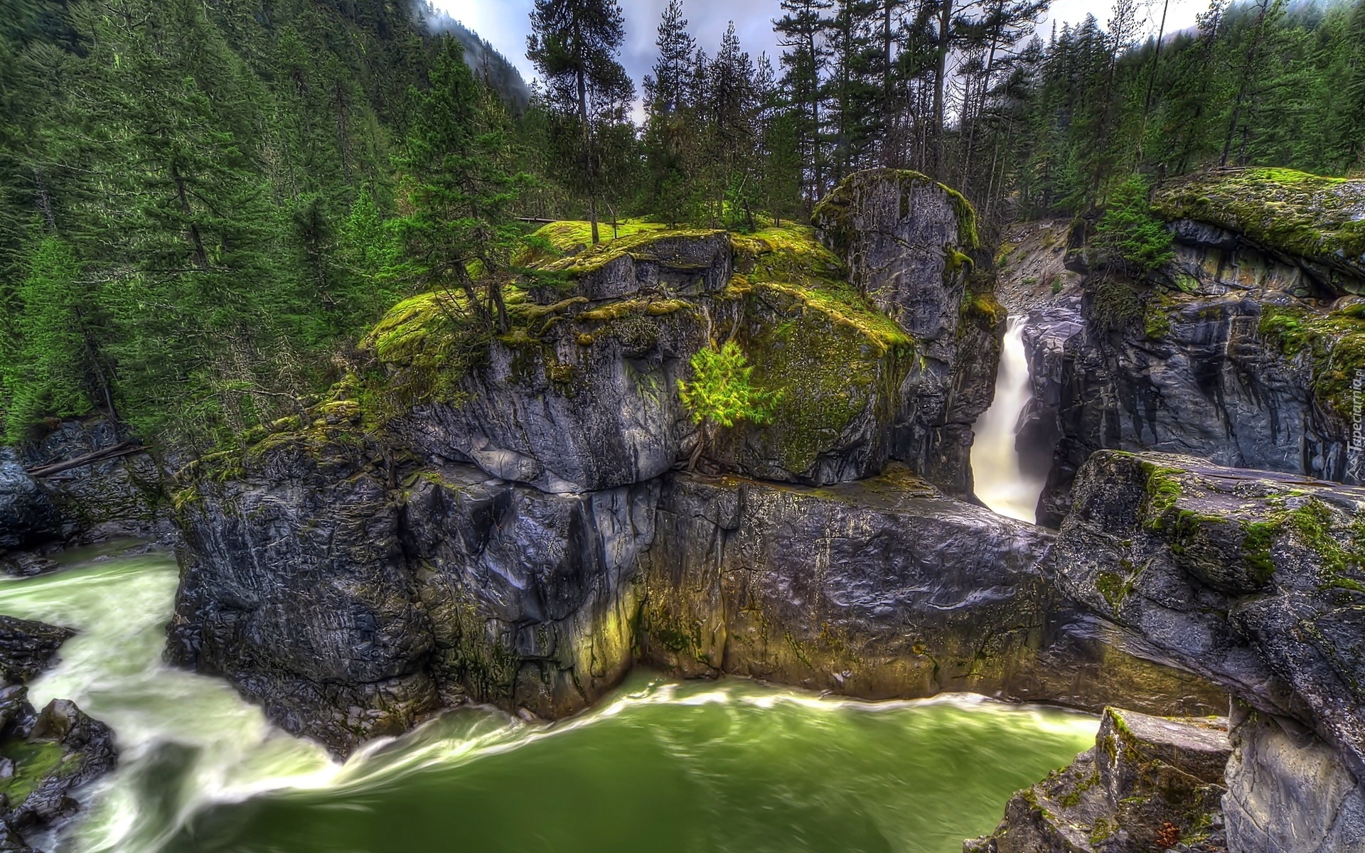 Edytor tapety: Wodospad, Skały, Las