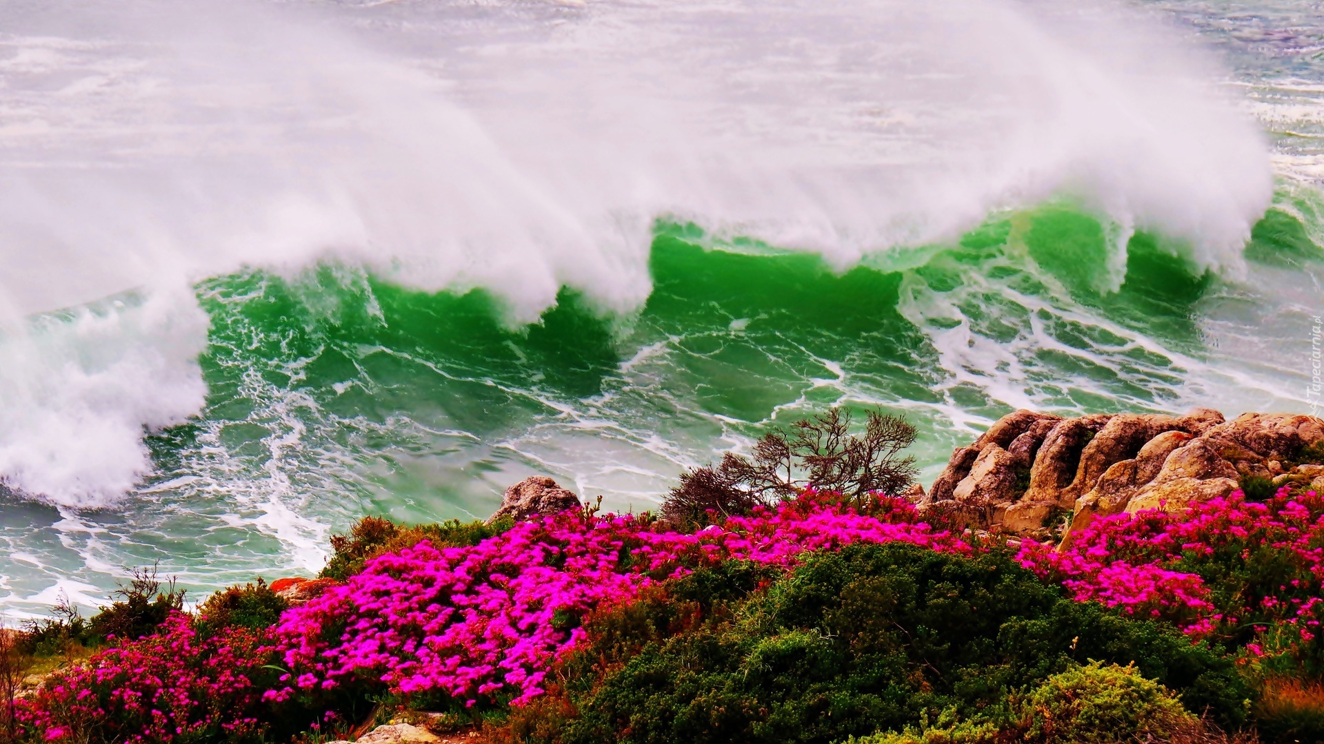 Edytor tapety: Morze, Fale, Skały, Kwiaty, Brzeg