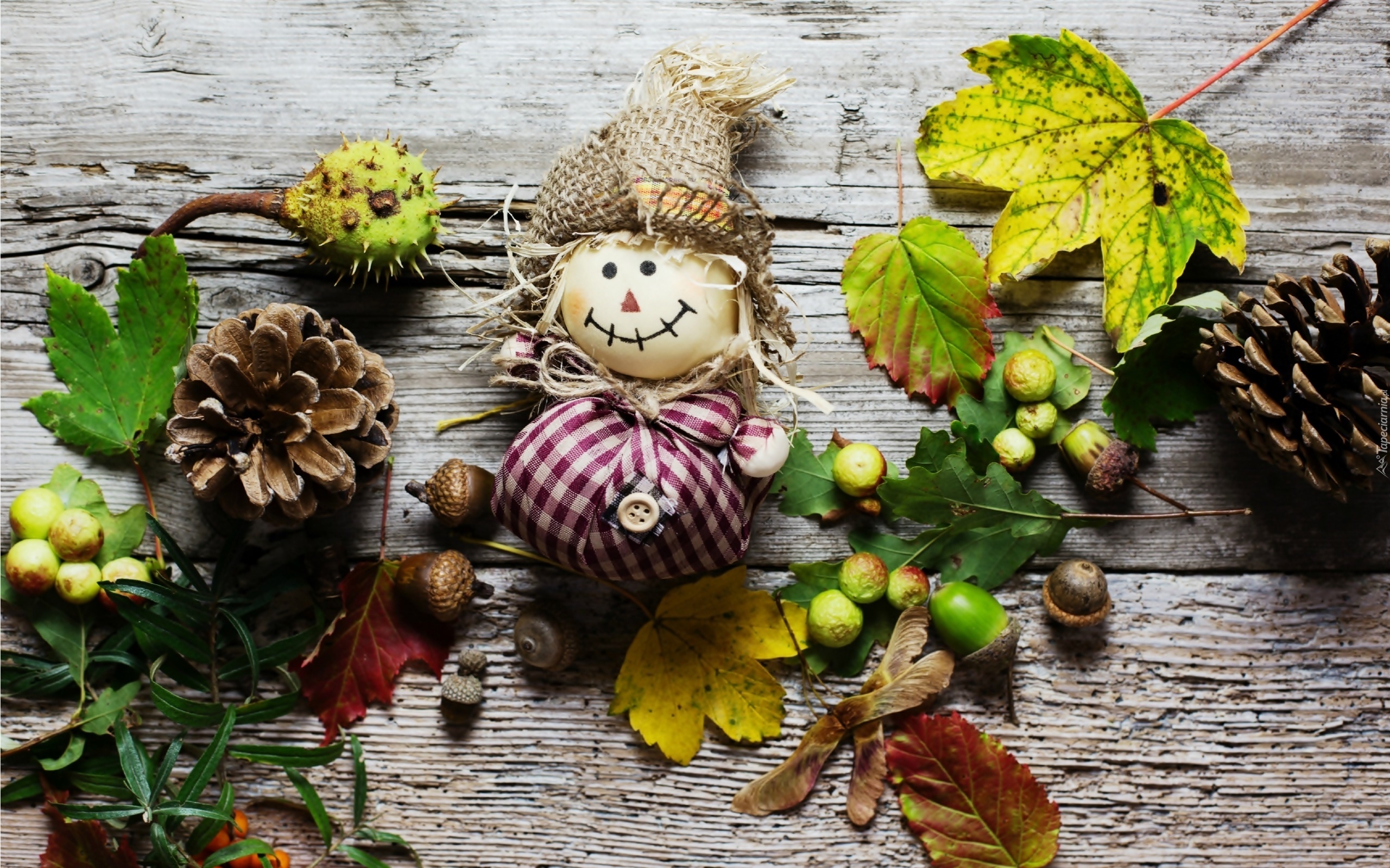Edytor tapety: Szyszki, Żołędzie, Kasztany, Liście, Laleczka, Jesienna, Kompozycja
