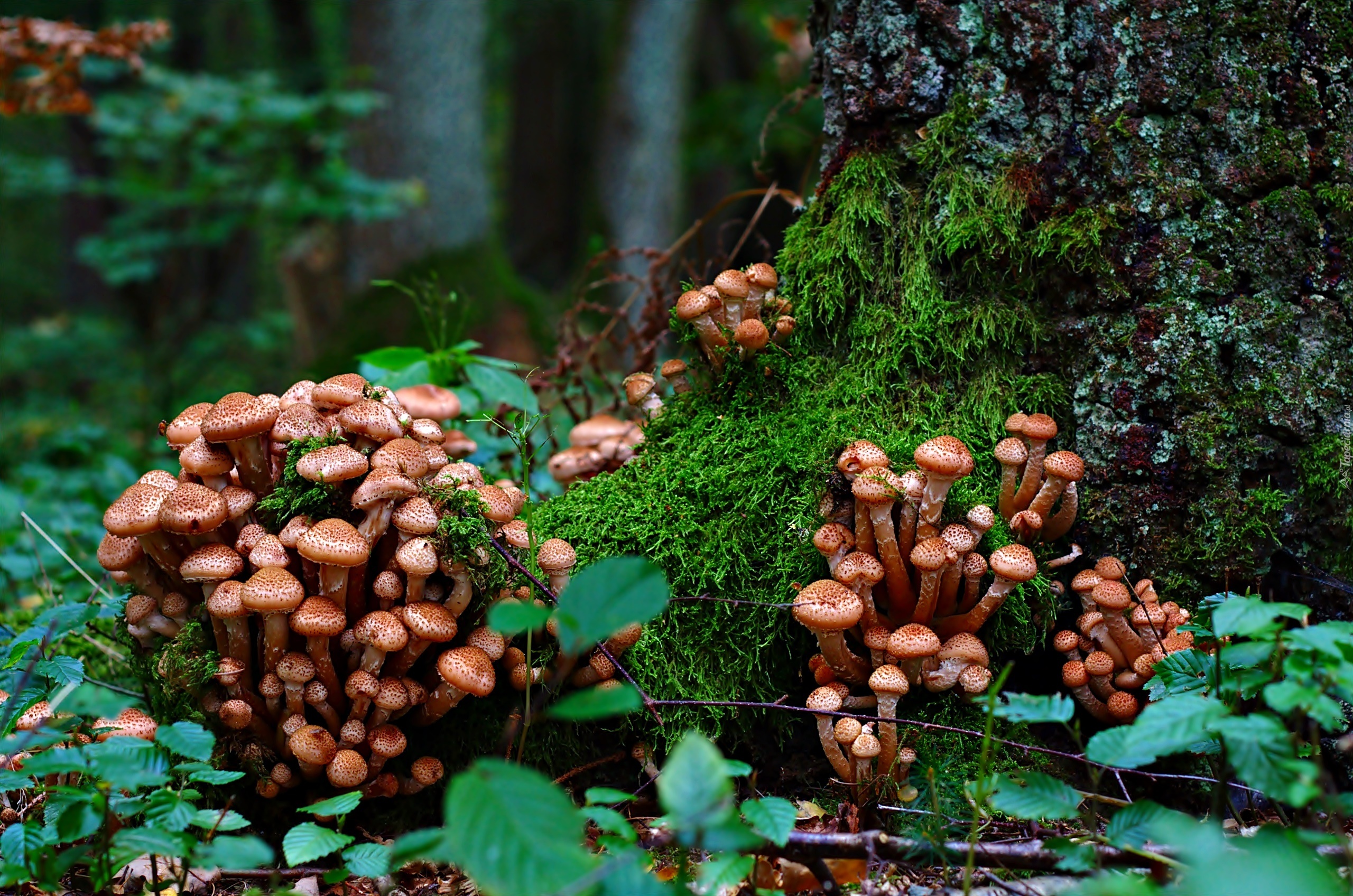 Edytor tapety: Grzyby, Opieńka Złocista, Mech, Drzewo, Las