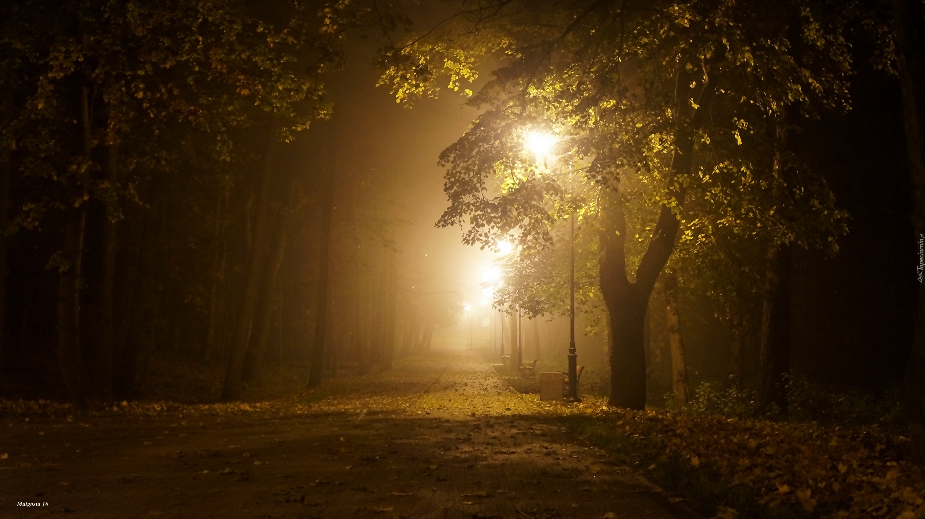Edytor tapety: Park, Drzewa, Noc, Alejka, Latarnie, Mgła