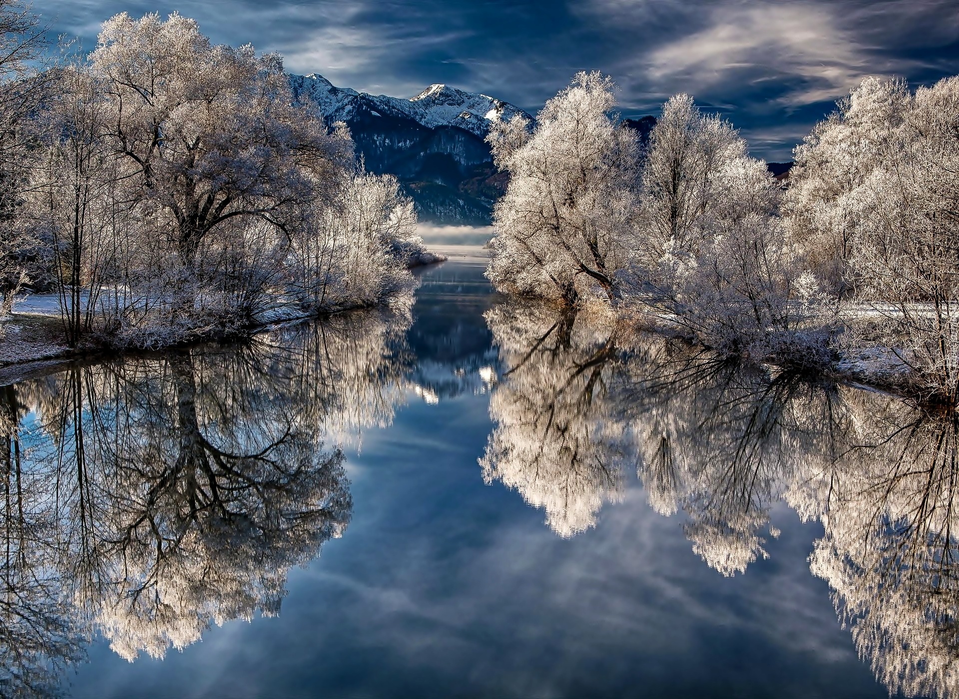 Edytor tapety: Rzeka, Drzewa, Szron, Zima, Odbicie, Góry