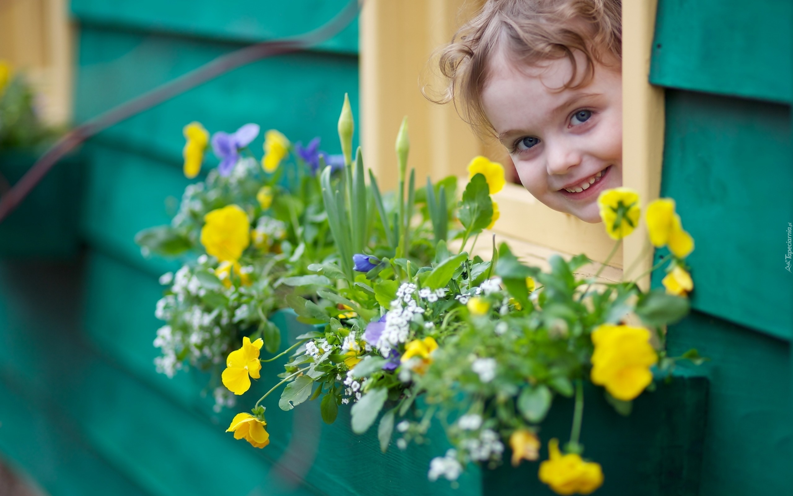 Edytor tapety: Dziewczynka, Okno, Kwiaty, Bratki