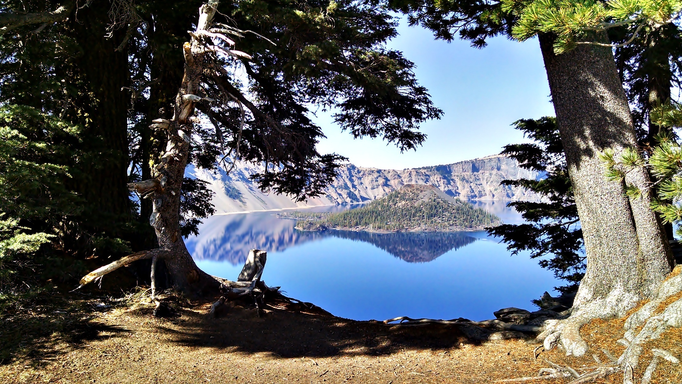 Edytor tapety: Jezioro Wulkaniczne, Wyspa, Góry, Drzewa