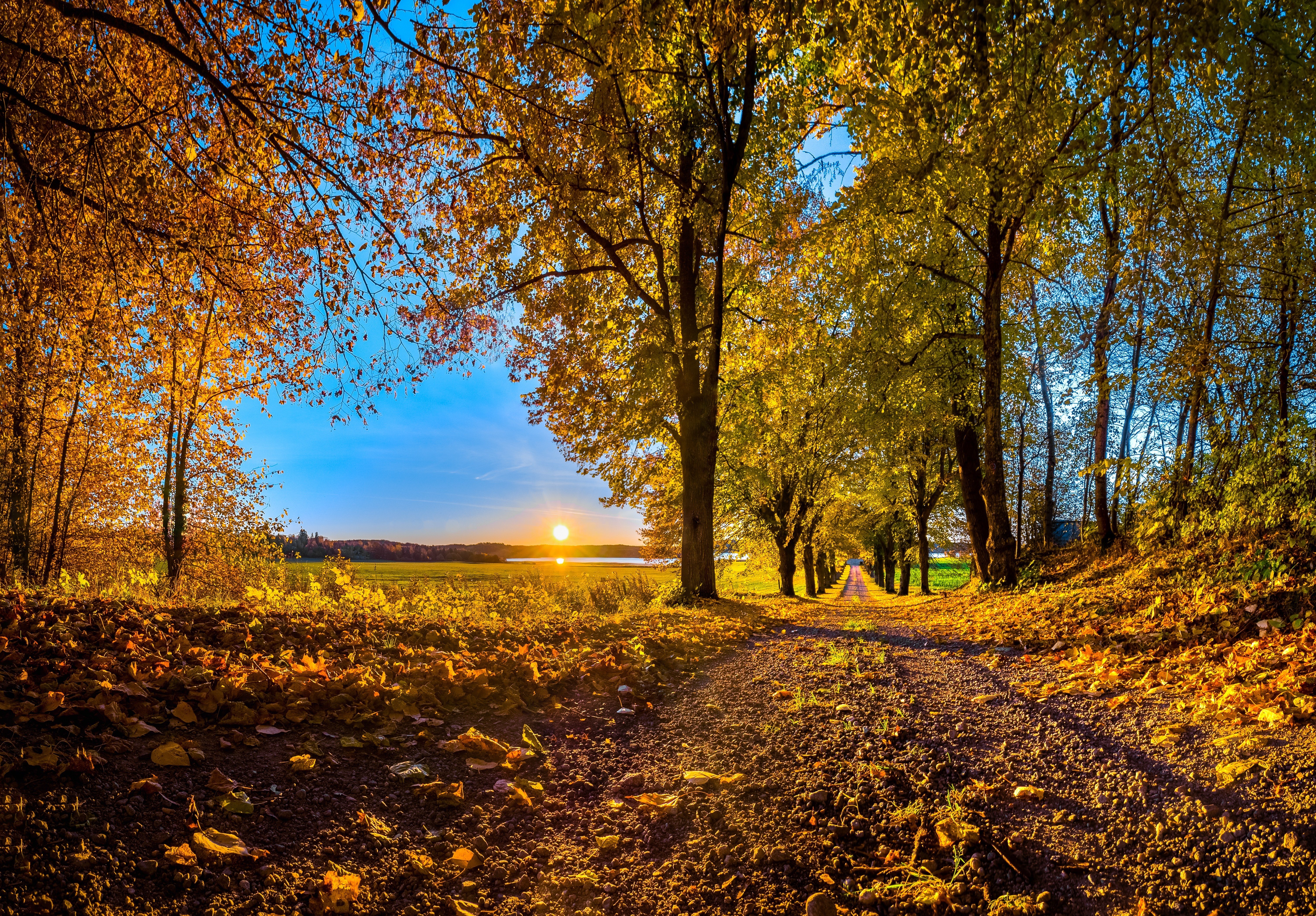 Edytor tapety: Jesień, Zachód Słońca, Droga, Liście, Drzewa