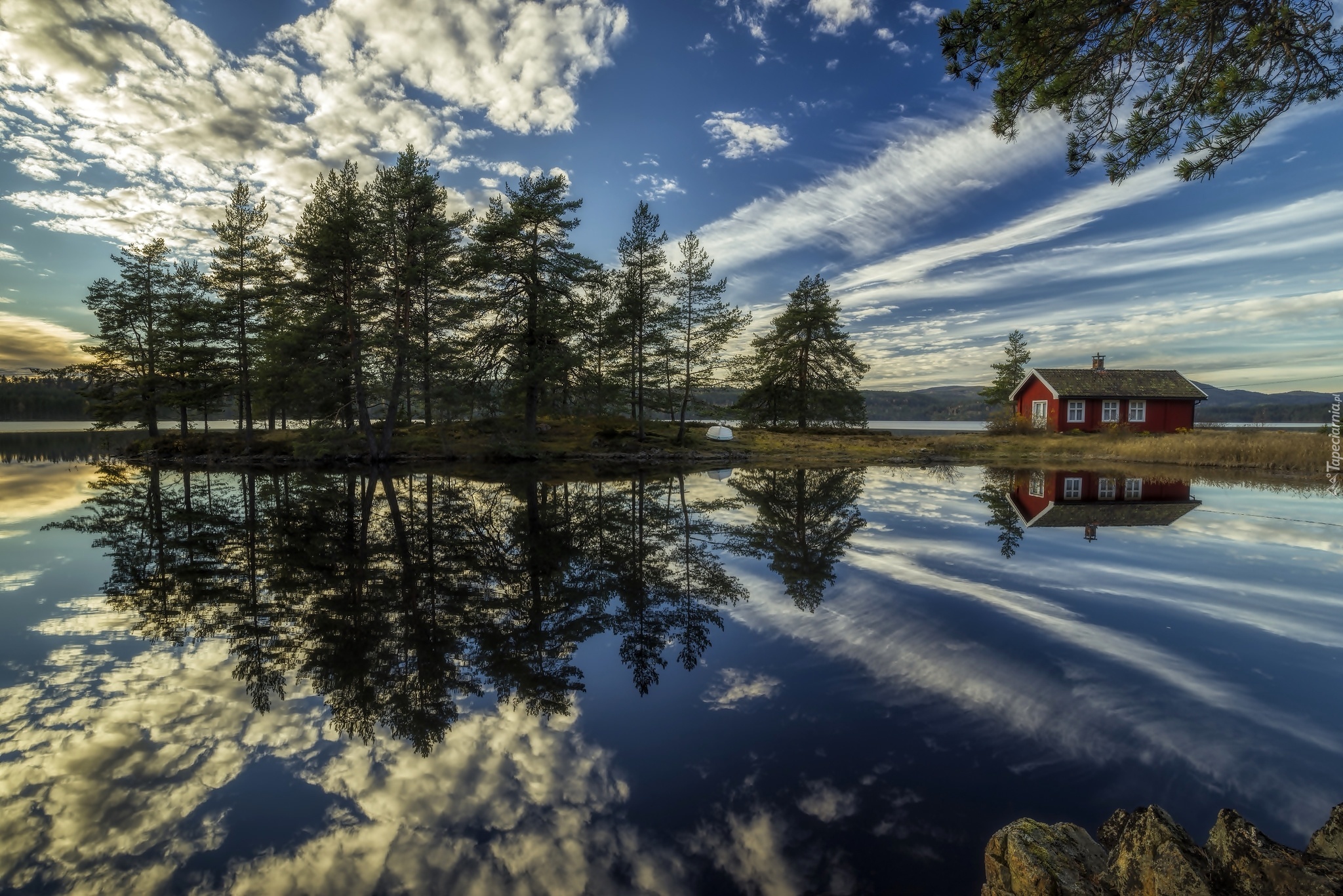 Edytor tapety: Jezioro, Drzewa, Niebo, Chmury, Domek, Odbicie