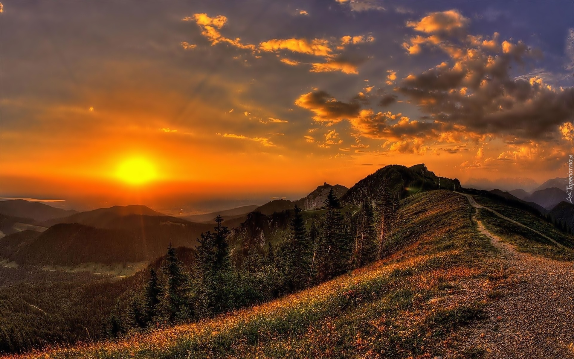 Edytor tapety: Góry, Lasy, Szlak, Ścieżka, Złoty, Zachód, Słońca, Chmury