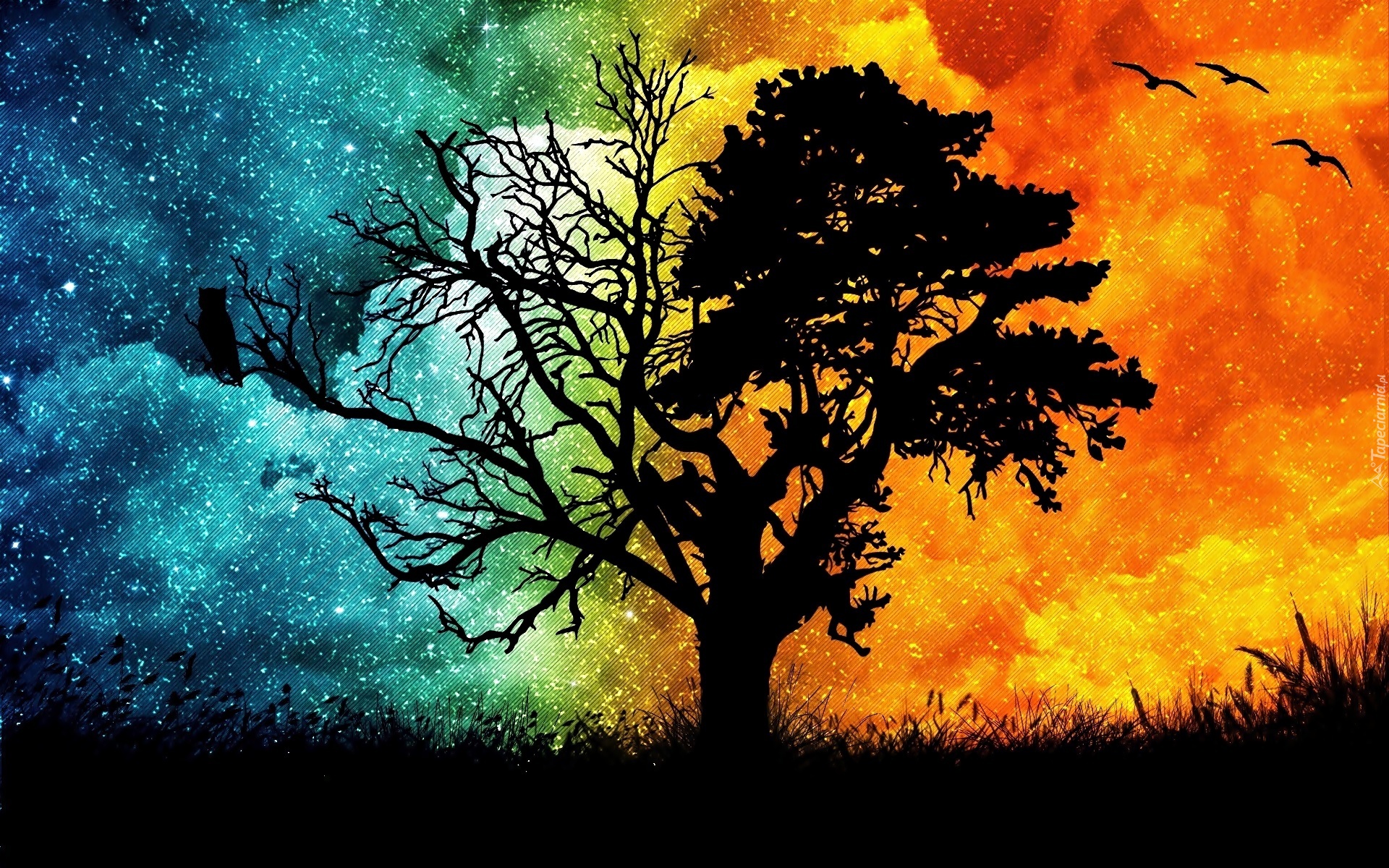 Edytor tapety: Drzewo, Ptaki, Ogień, Woda, Abstrakcja