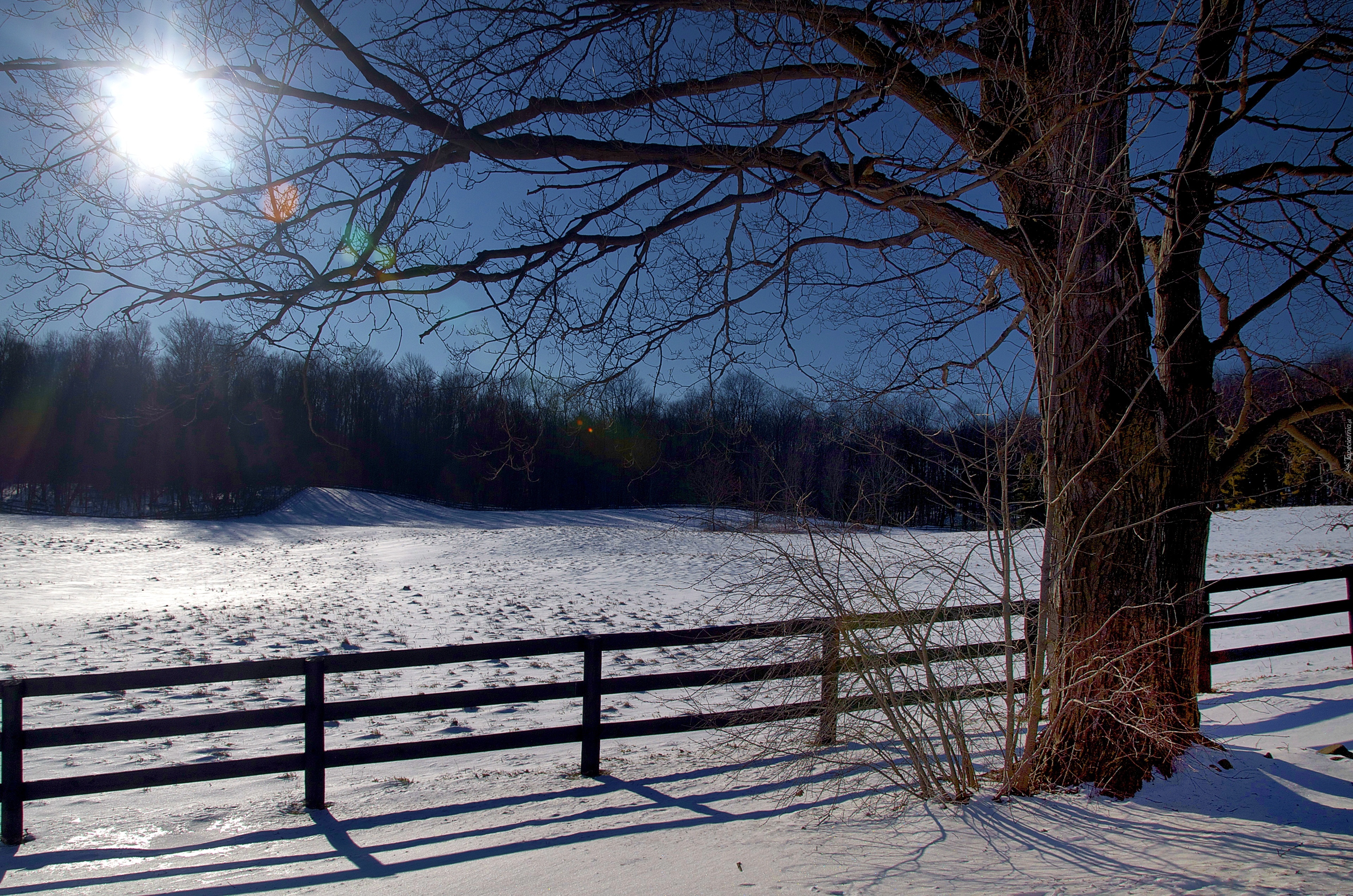 Edytor tapety: Zima, Drzewa, Ogrodzenie, Śnieg ,Słońce