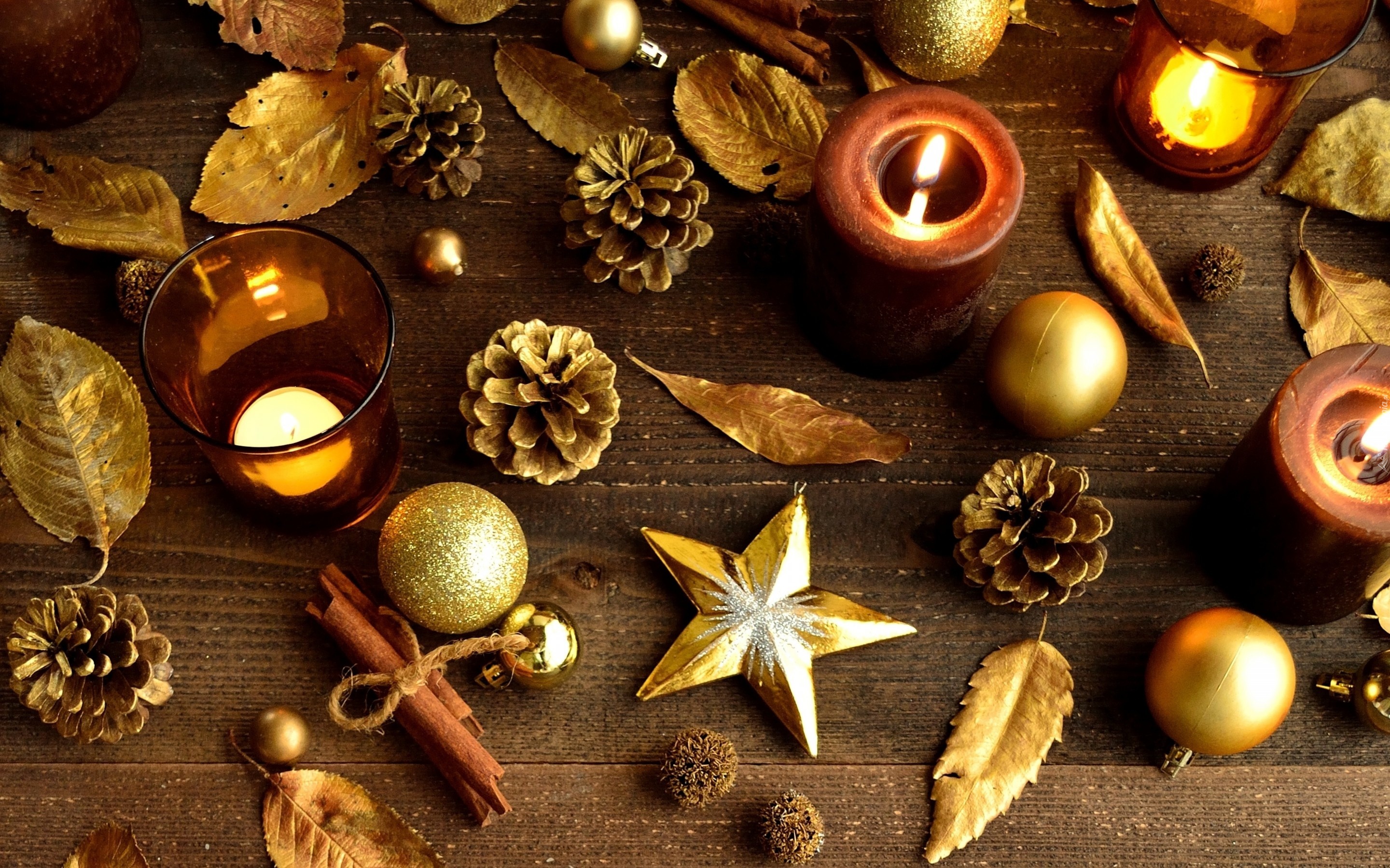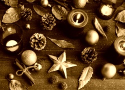 Edytor tapety: Świeczki, Szyszki, Liście, Bombki