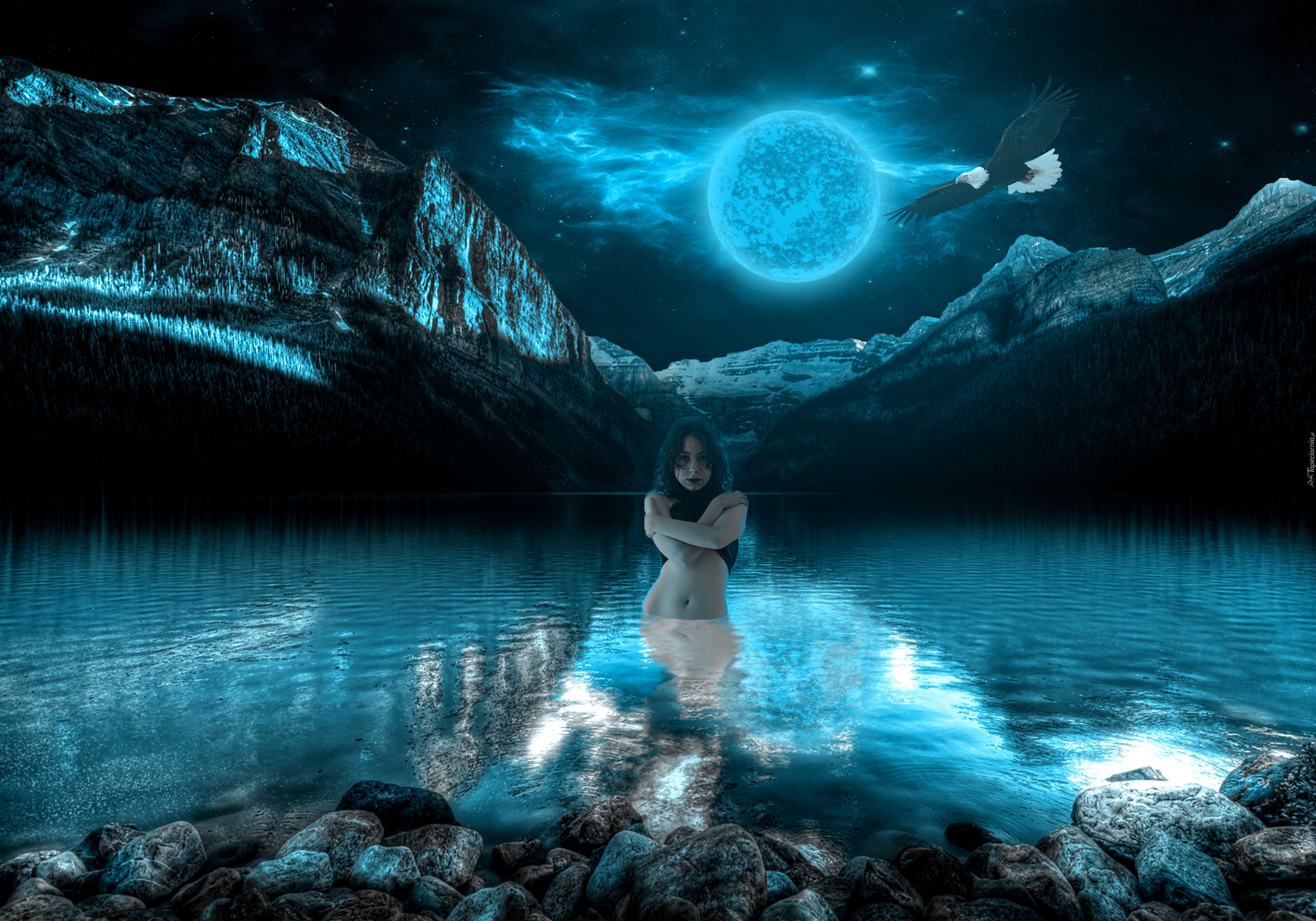 Edytor tapety: Fantasy, Kobieta, Góry, Jezioro, Noc, Księżyc