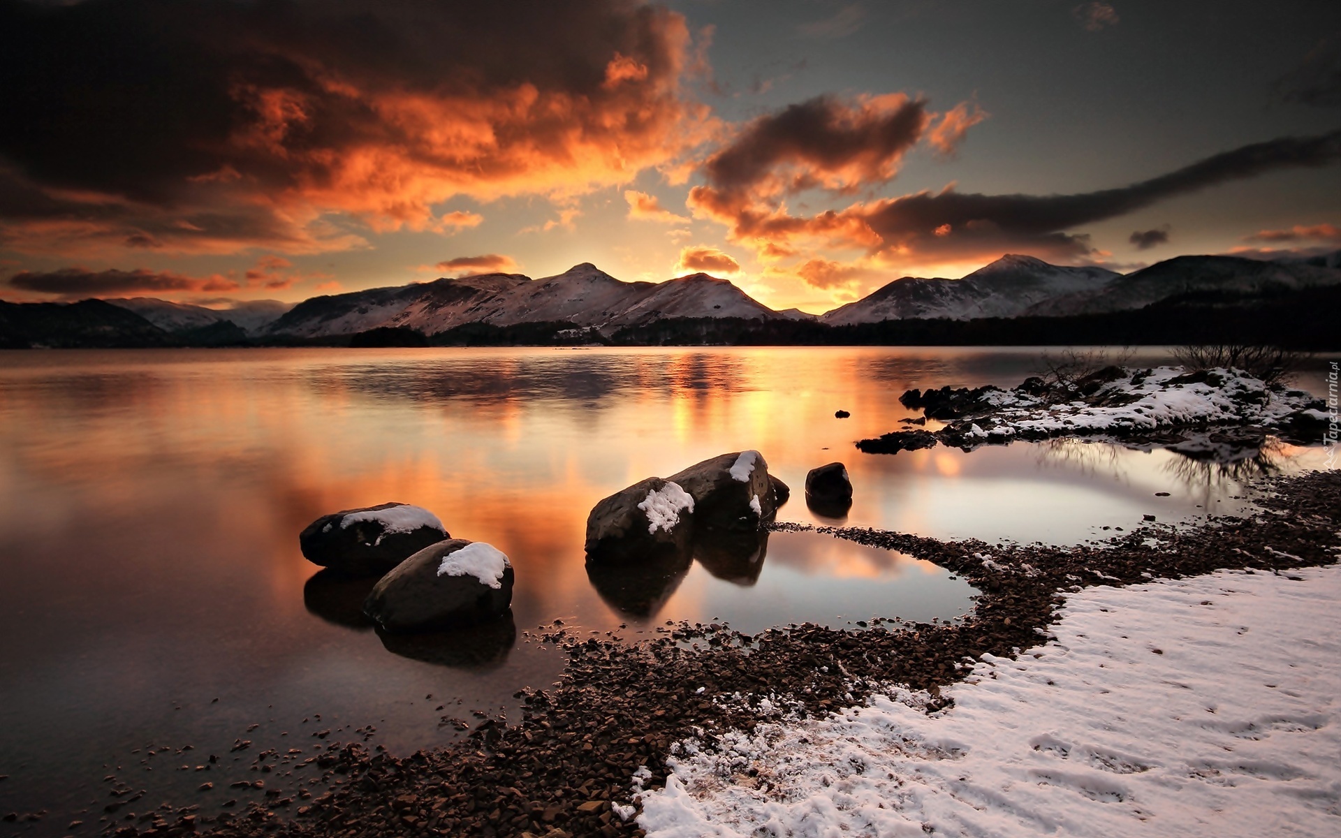 Edytor tapety: Jezioro, Zachód Słońca, Góry, Kamienie, Śnieg
