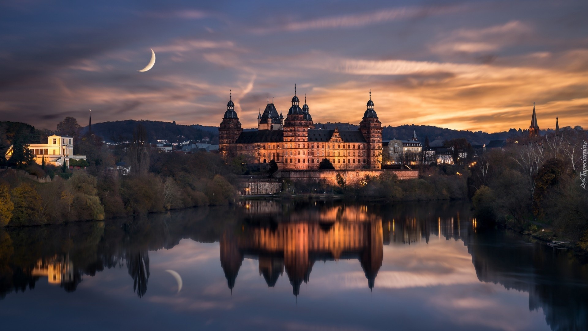 Edytor tapety: Zamek Johannisburg, Miejscowość Aschaffenburg, Bawaria, Niemcy, Jezioro, Noc