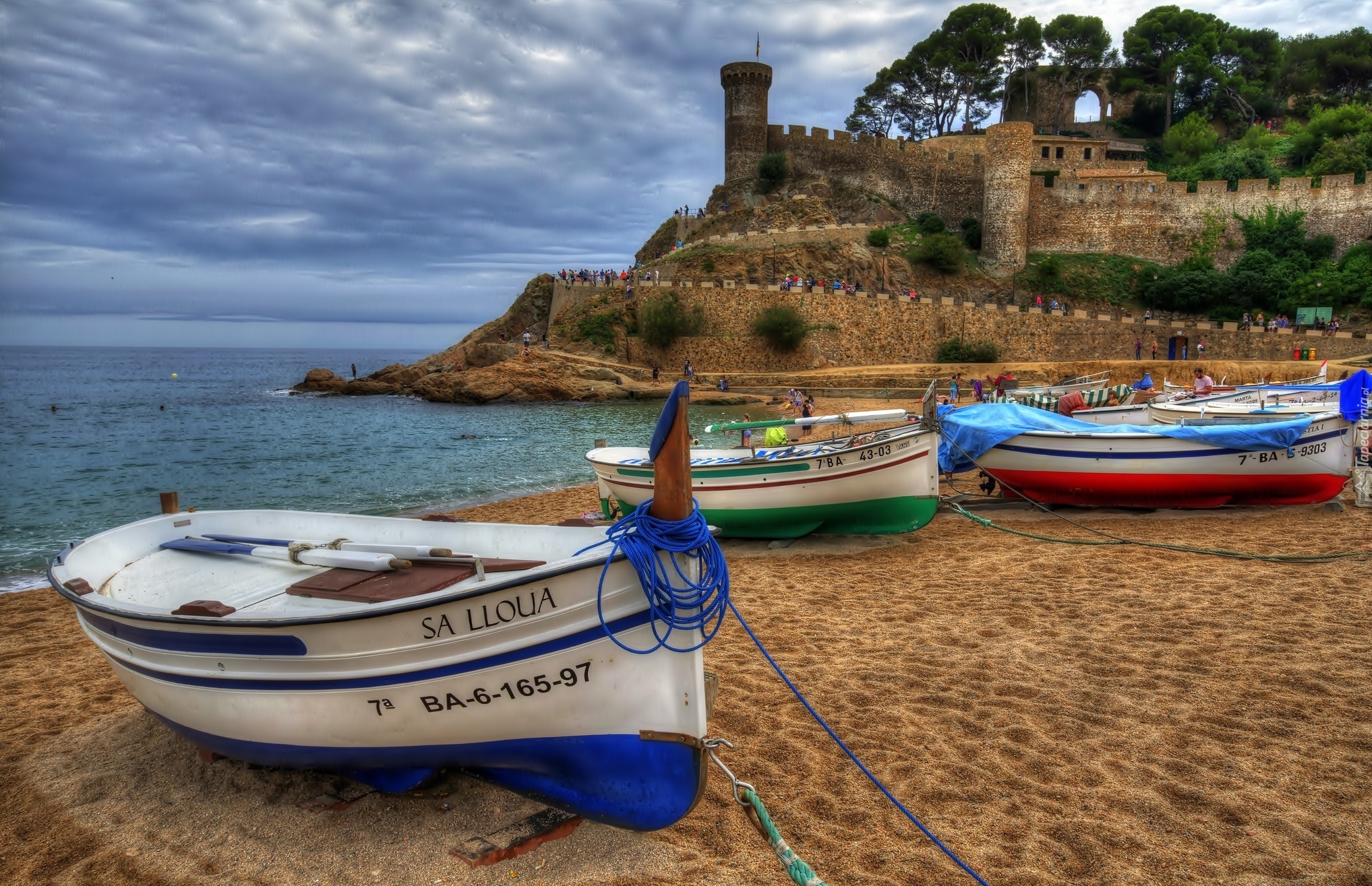 Edytor tapety: Tossa de Mar, La Vila Vella, Costa Brava, Katalonia, Hiszpania, Plaża, Łódki, Morze, Mury obronne, Fortyfikacje