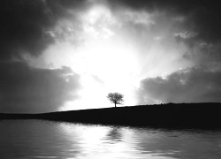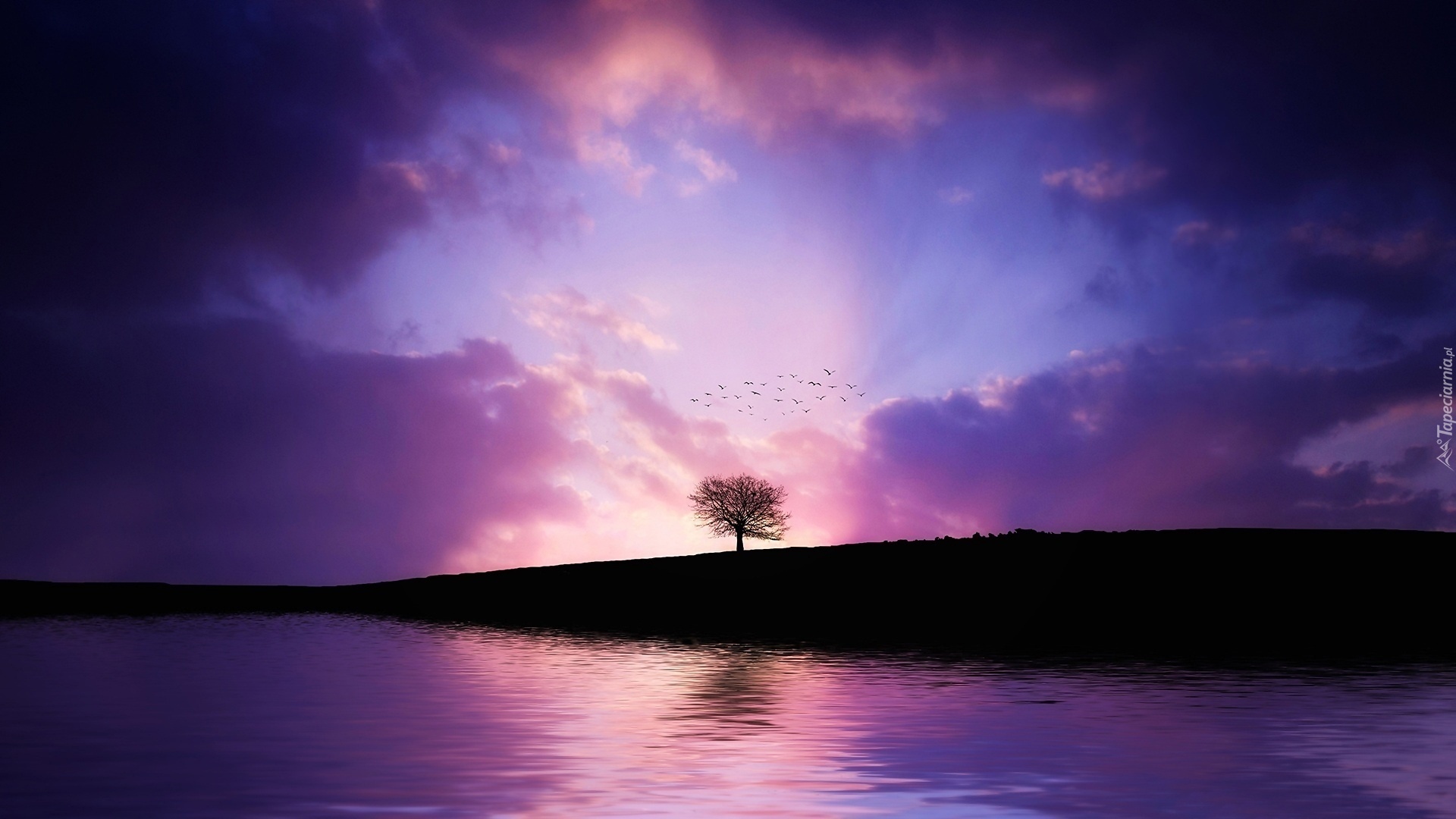 Edytor tapety: Wieczór, Jezioro, Niebo, Chmury, Ptaki, Drzewo