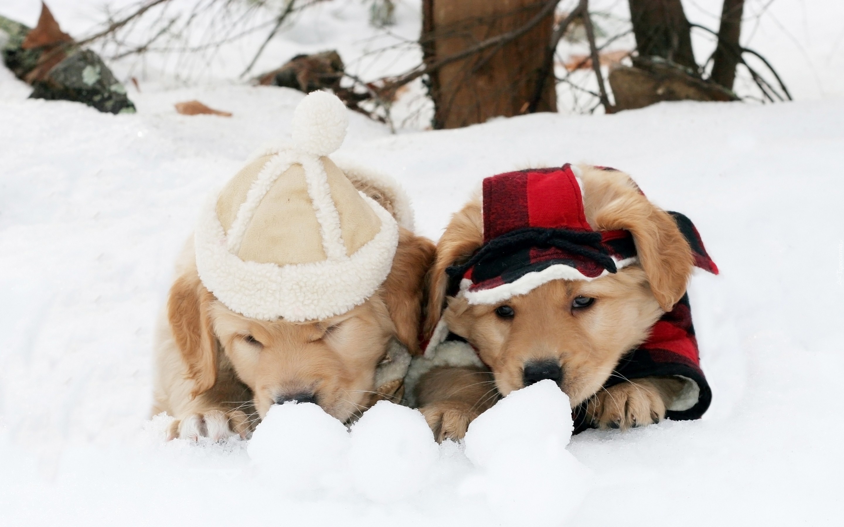 Edytor tapety: Zima, Śnieg, Psy, Szczeniaki, Golden Retriever